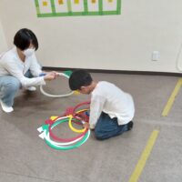 先ずはスタッフと一緒に問題文を確認です。「どちらの四角がおおきいかな?」問題の内容もスタッフと話をしながら進めます。