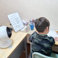 こちらも新・中学生。小学校の復習中。終わった後は「おばけキャッチ」というゲームをしました。出てくるカードをよく見て、ここに使われていない物と色の物を選びます。正しいものが描かれていればそのものを選びます。この場合は「ネズミ」が正解。やっていくうちに、頭がこんがらがってきます・・・