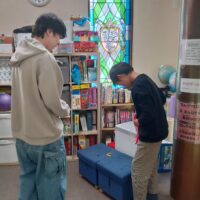 彼の活動するところを撮らせてもらおうと覗いてみると、、、左側にキーボードがありました。何に使うかきいてみると、なんと、自作のゲームがあってそれに使うために持ってきたと説明してくれました。彼は趣味がプログラミングなので、その作品をスタッフに見せようと持ってきてくれたそうです。