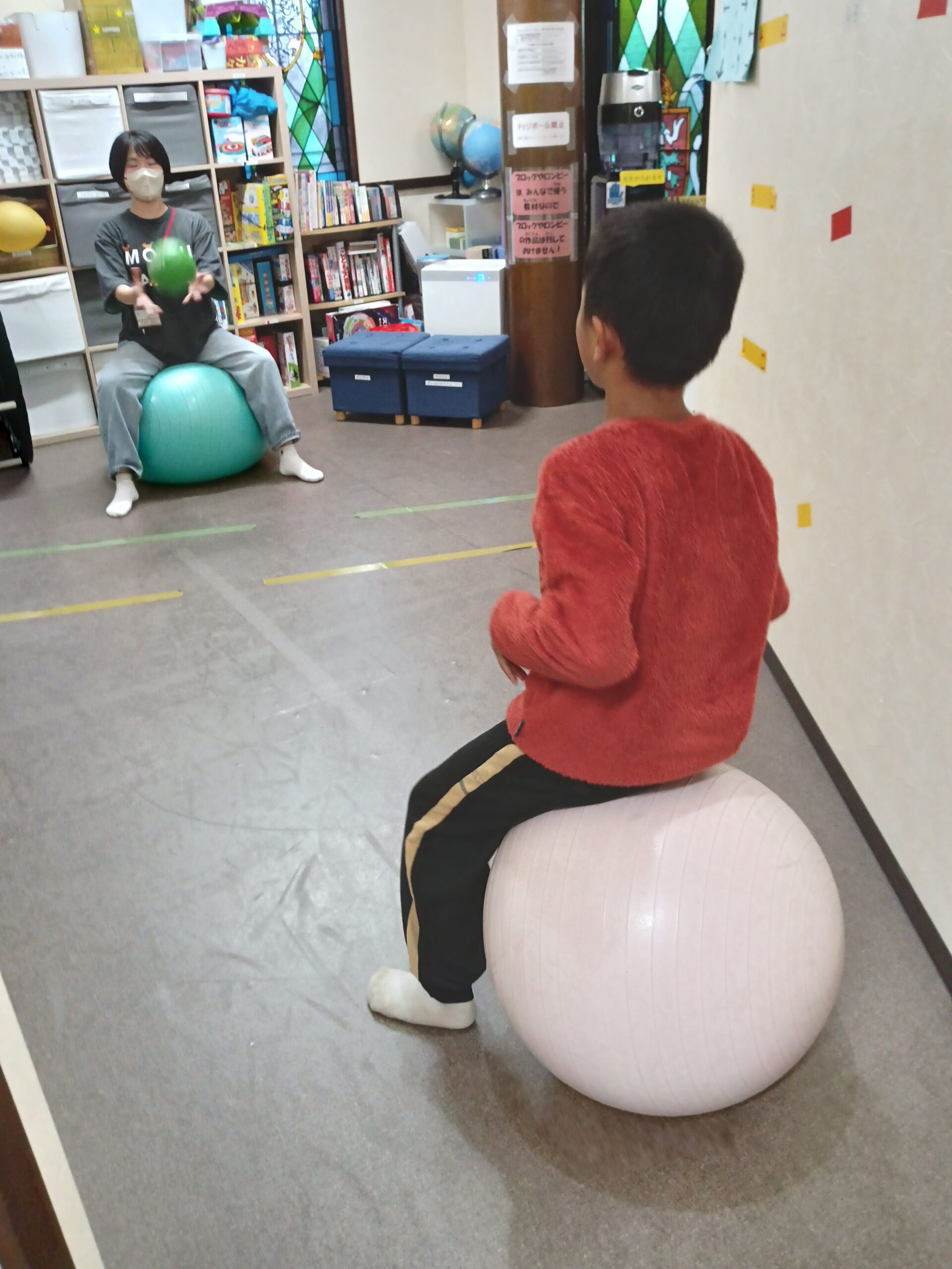 宿題の前にまずは運動をして気持ちを発散させたいようで、早歩きでプレイルームへ向かっていました。今日は運動会の練習で足が疲れていると話してくれていたので、予定していた運動をバランスボールの活動に変更しました。ゆったりと運動できたのでスッキリした顔をしていました(⌒∇⌒)