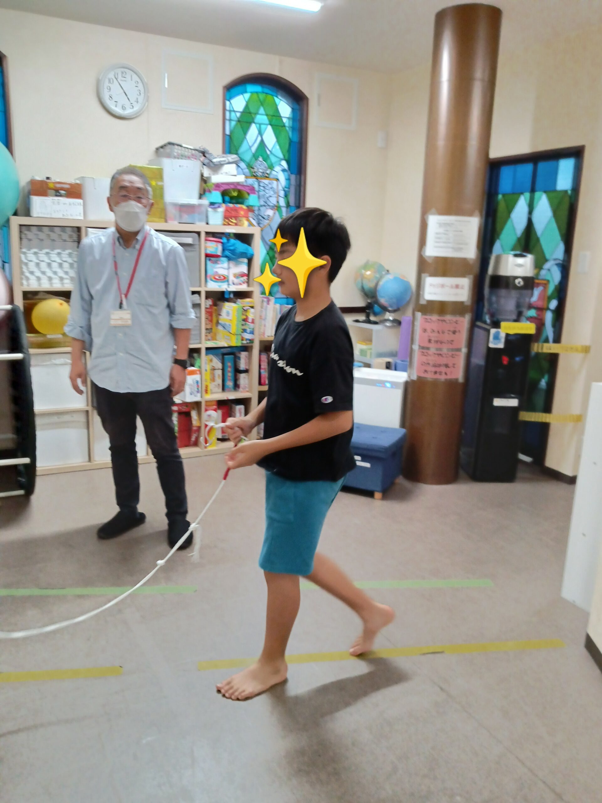 運動の準備で、ネット役の紐を張ってくれています。積極的に準備を手伝ってくれていました(^^)v