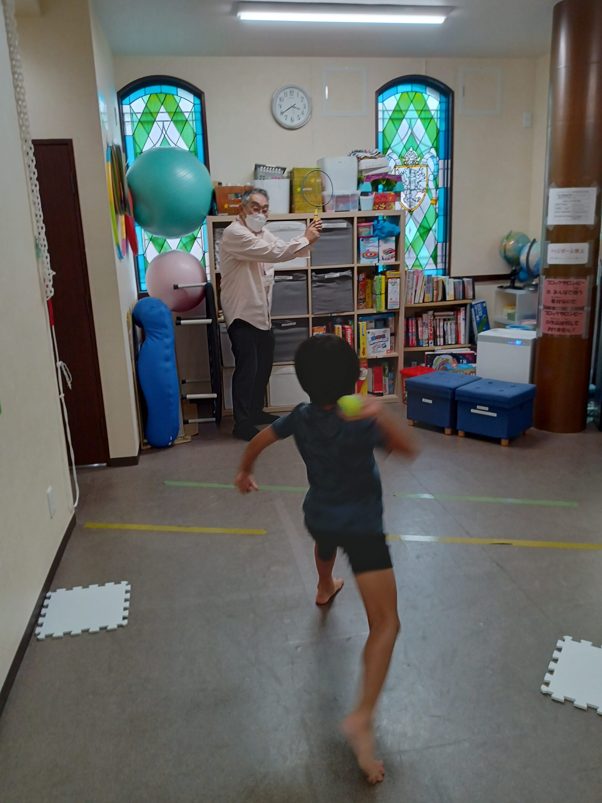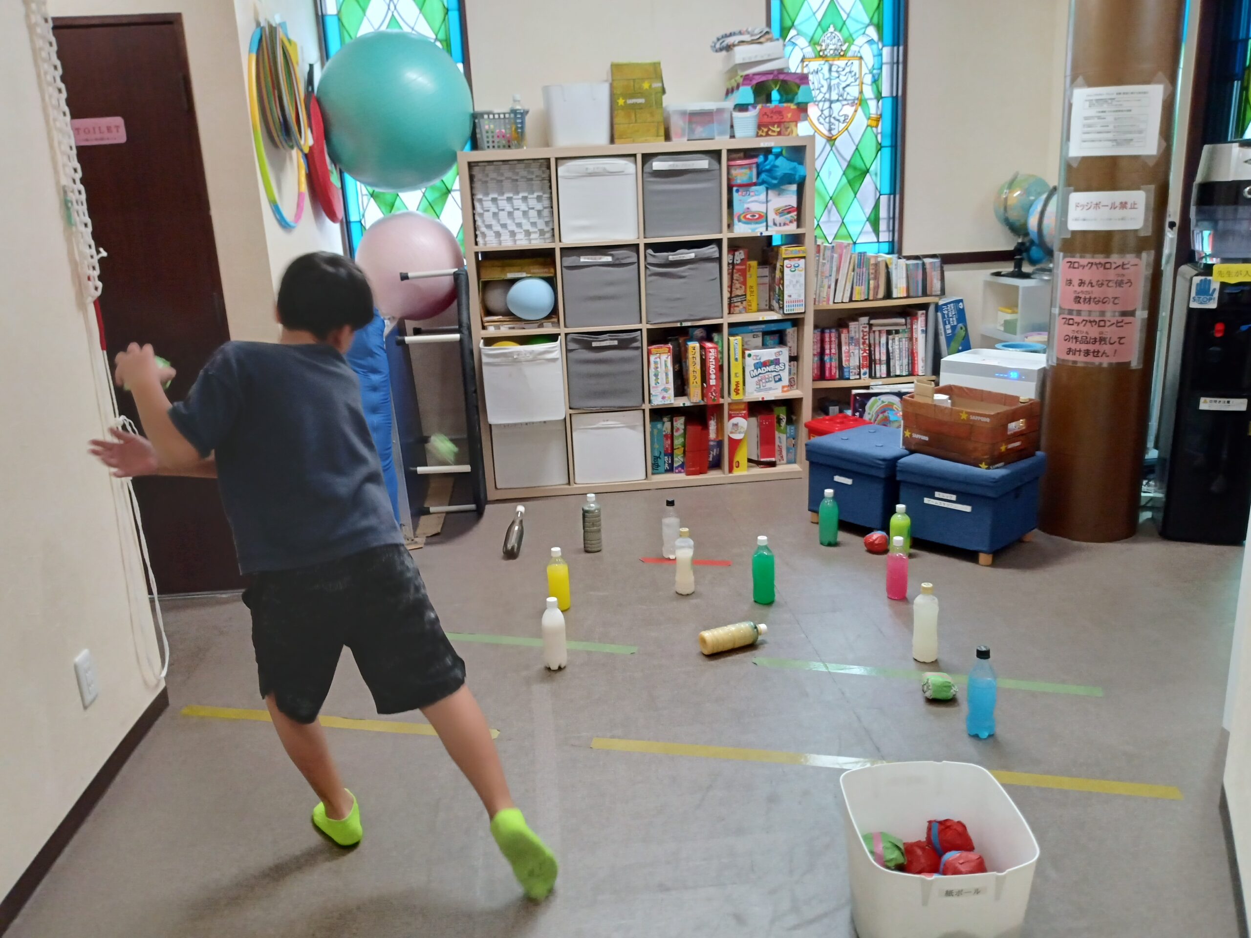 手指の体操から始め、運動では豪快にペットボトルボーリング、最後は画伯の登場でした!