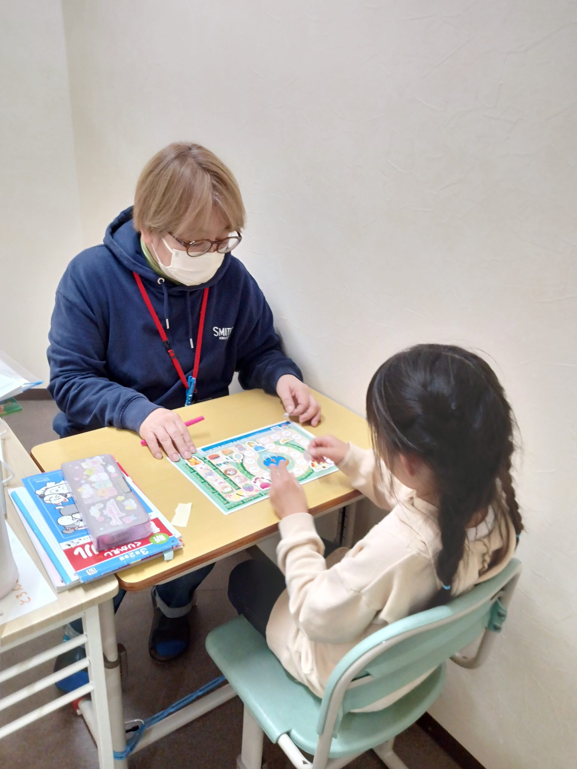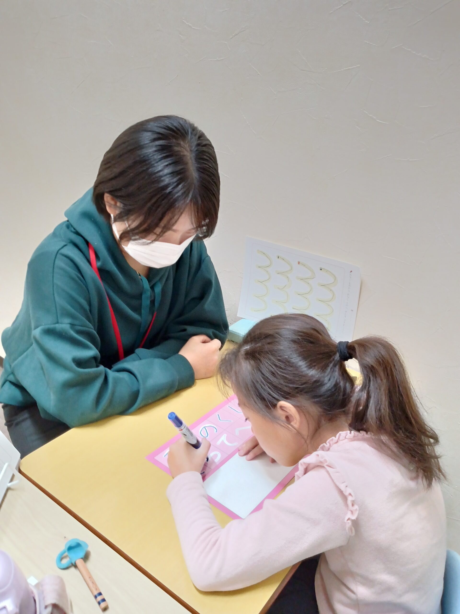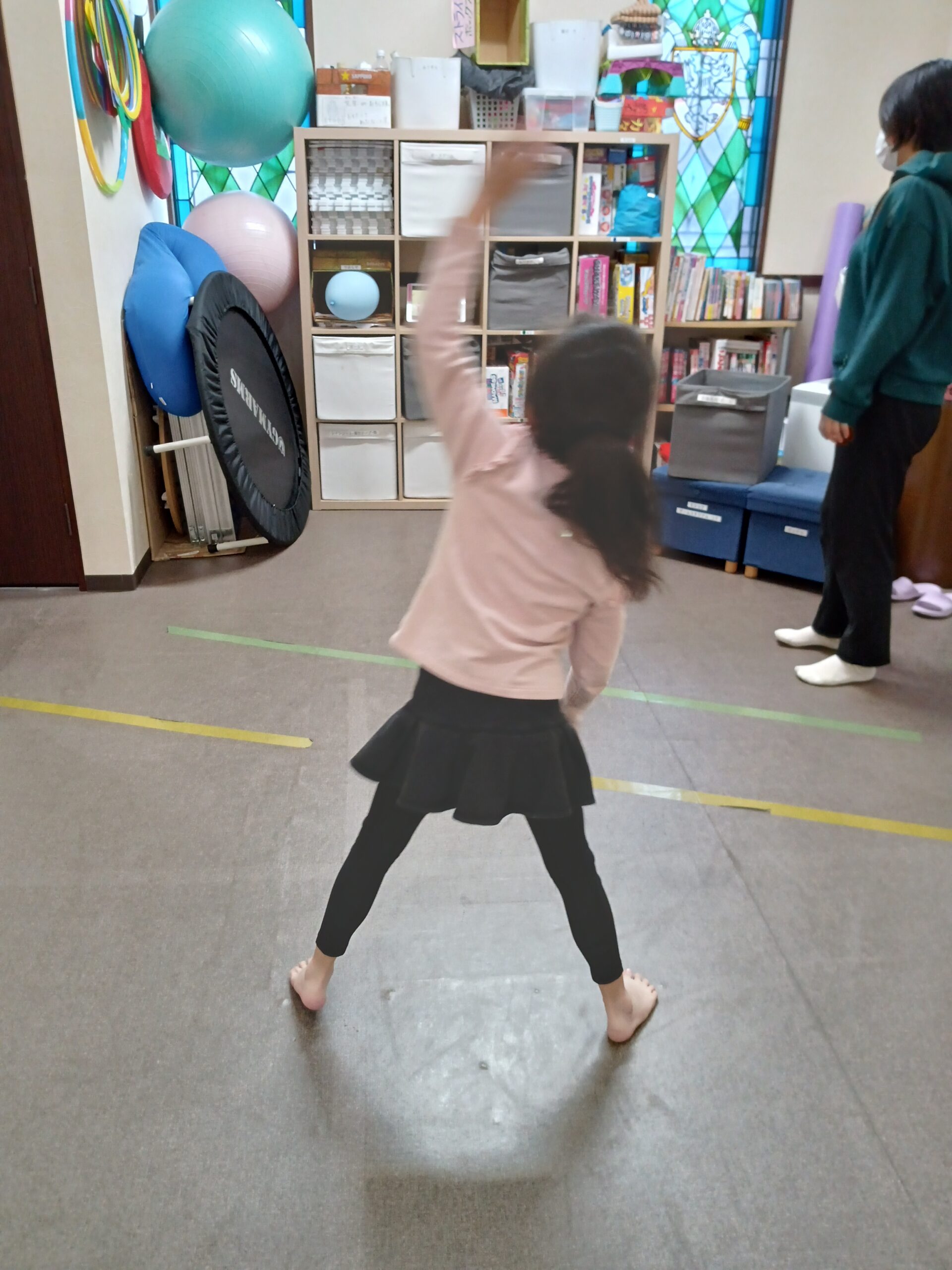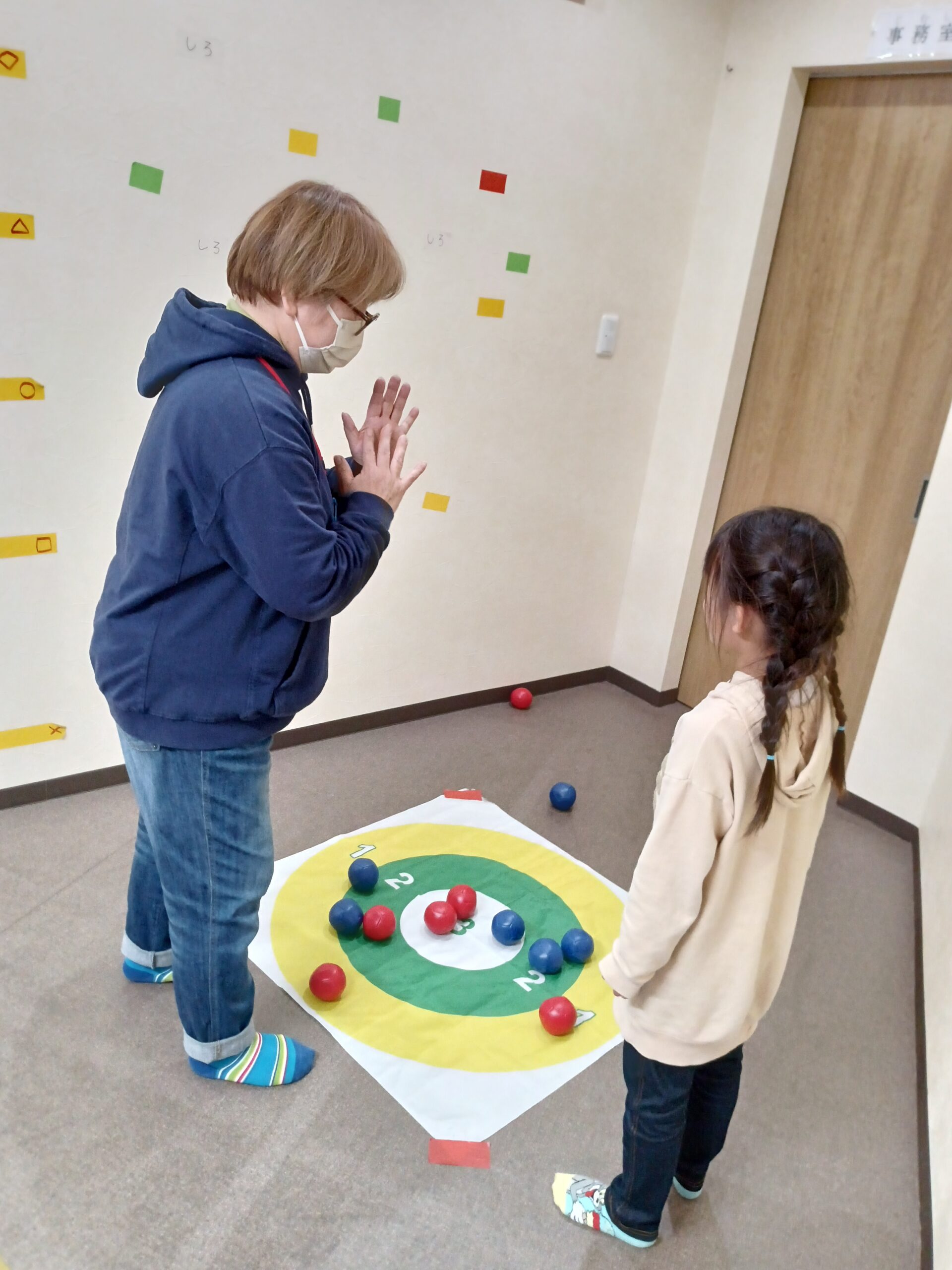題して「コロコロカップイン💓」です。どこに転がってくるのかは伝えずにする活動で、ビジョントレーニングの一環として取り組んでもらっています。彼女は腰を低くして膝を上手に使ってカップに入れていました。