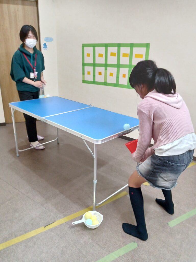9枚めの画像ですが、プレイルームでミニ卓球台を出してスタッフが転がしたボールを卓球台の端で受けるという活動です。