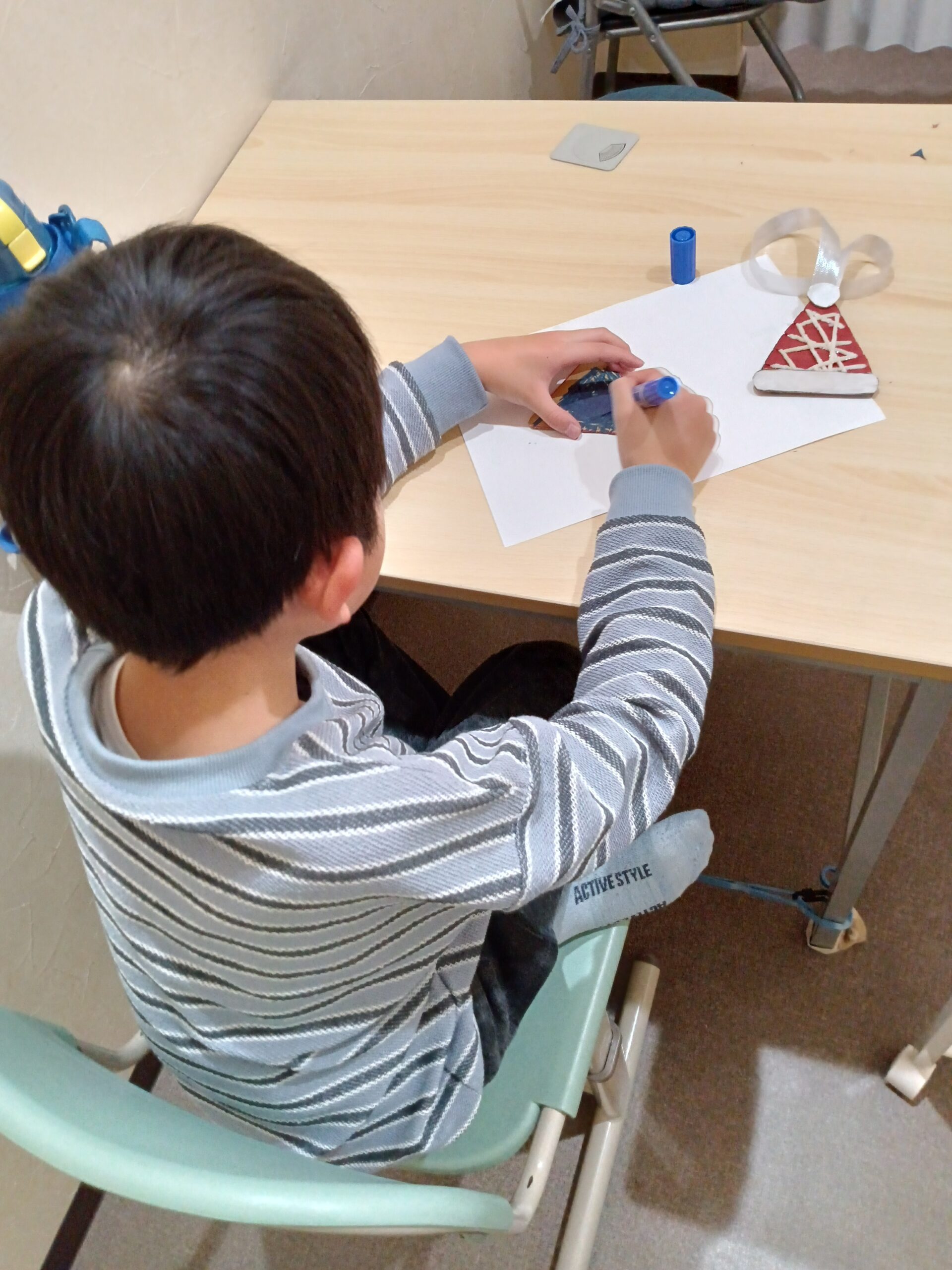 チラッと見えていますが、クリスマスツリーに飾るオーナメントを製作中です。自分でリボンや土台の色を決め作ります。