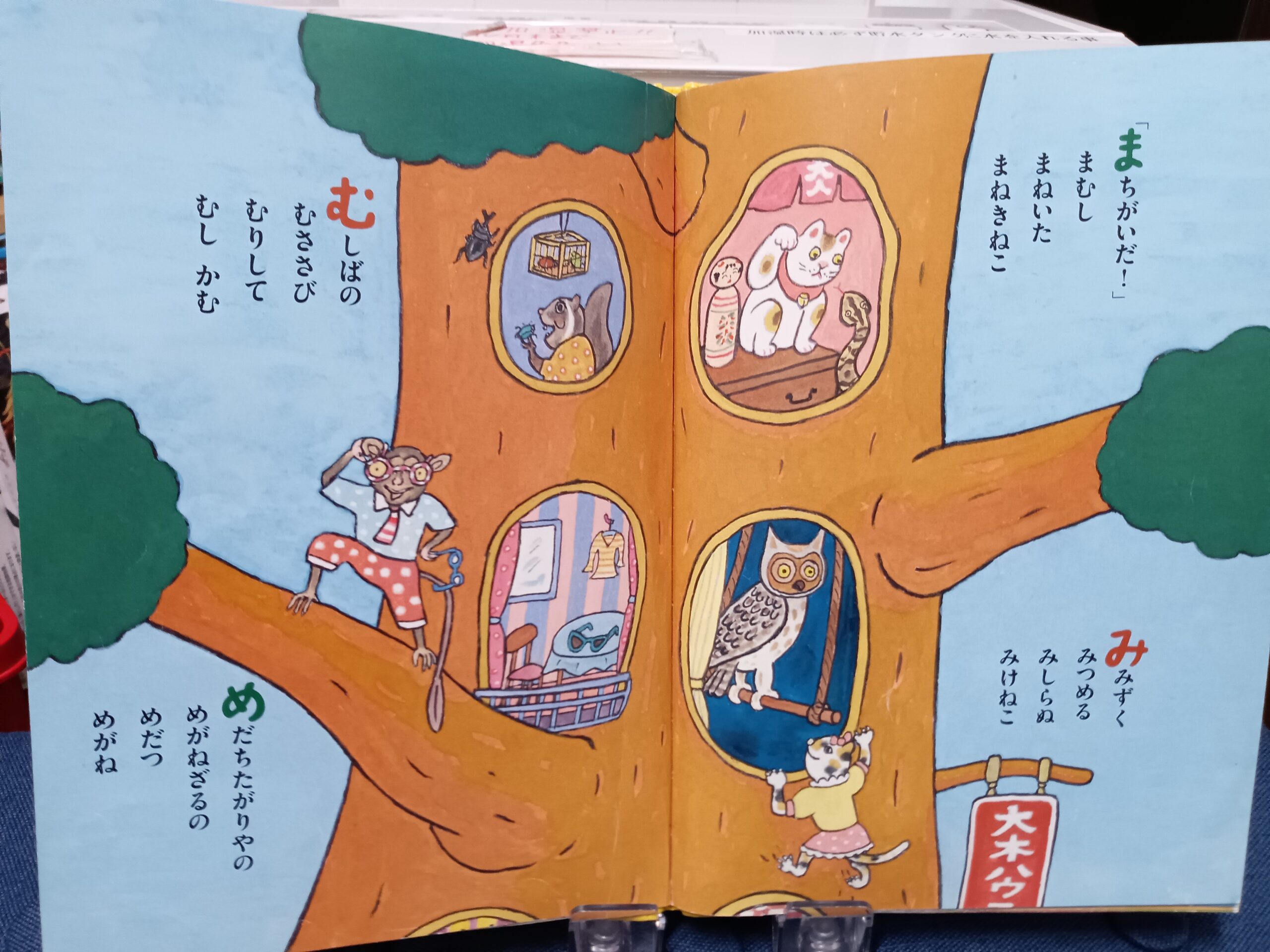 そして、こちらは最近私がはまっている教材です。「あいうえおのえほん」と言うのですが、なにがいいって、まず、絵です。なんとも味のある絵で惹きつけられます。あとは、「あ」から順番に短い文章が書いてあって、読むのが苦手な子たちでも読みやすい長さなんです。ちょっと古いので知らない言葉も会ったりするのも、逆に言葉の勉強・・・とまでは言いませんが、知らない言葉に触れられるのもいいなぁと思っています。子どもによっては、自分で「ま」で短文を作ったりする子もいました。嬉しくて他の「み」や「め」の時も作って!と言うと、それは違ったみたいでした(反省)。