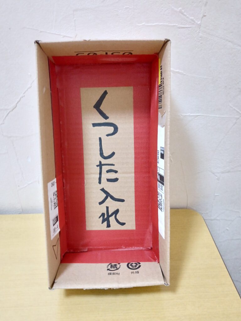 箱の底はこんな風になっています(⌒∇⌒)靴下の感覚が苦手で来所してすぐに靴下を脱ぎたい子がいるので、靴下を入れる箱として制作しました。お話に夢中になって靴下を脱ぎっぱなしにしてしまう事もあるので、靴下の置き場所を目で視て分かるようにしました。このボックスをお部屋に置いてから、靴下入れとして使ってくれています♪