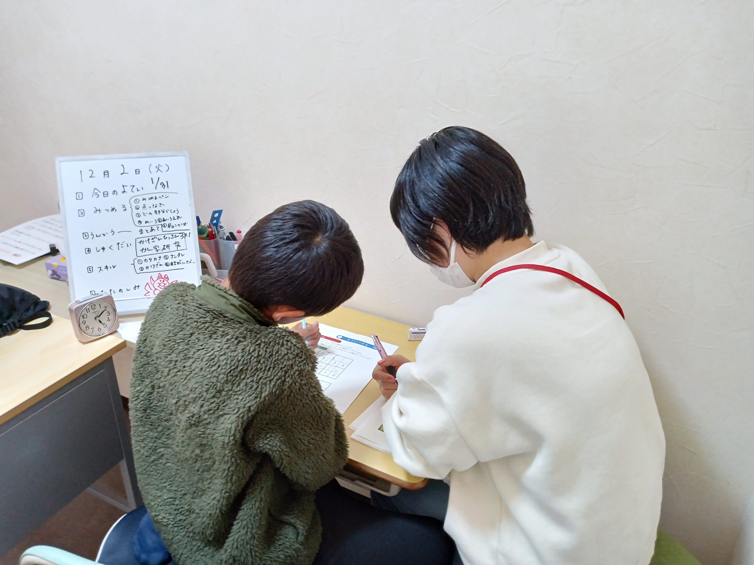 伝えたいことがあると、つい声が大きくなってしまう事ってありますよね。そのままでお話してもらいたい気持ちもありますが、他のお部屋で活動している子も居るのでお話をする時は声量を一緒に確認しています。彼も声量についてスタッフと確認してもらっています。言葉だけでなくカードを使って視覚的にも伝えています。その子に合った伝え方で関わりを深めていきたいですね。