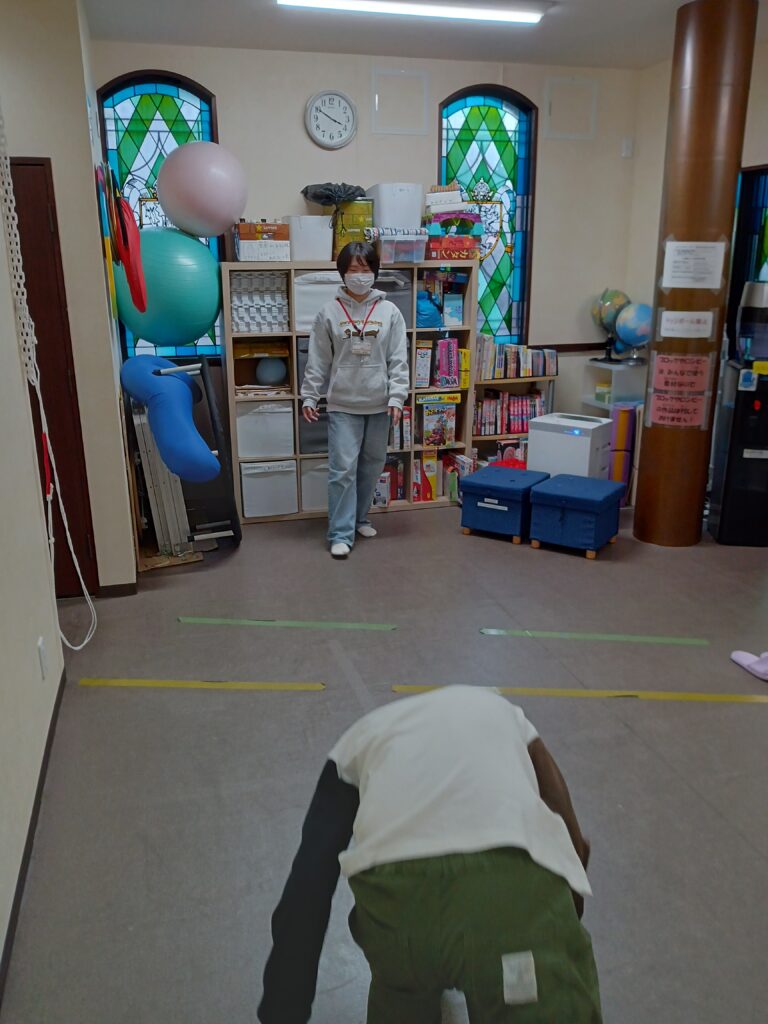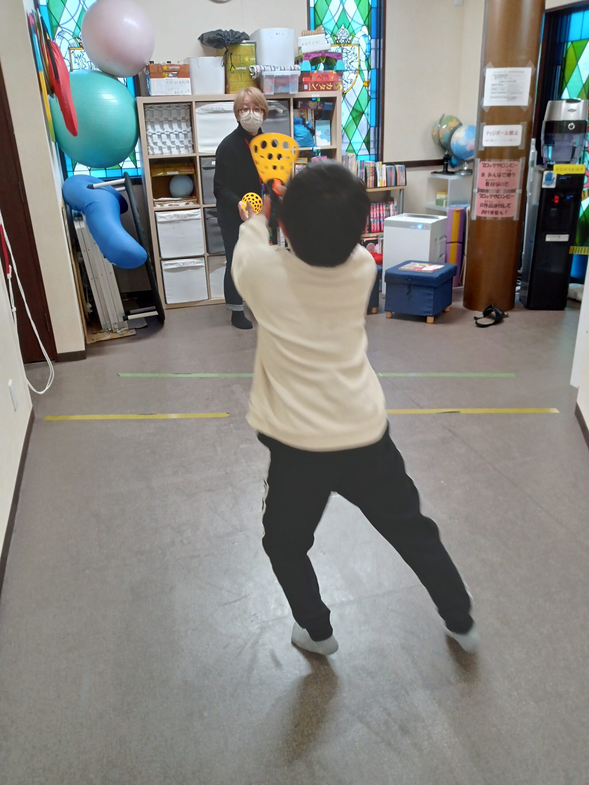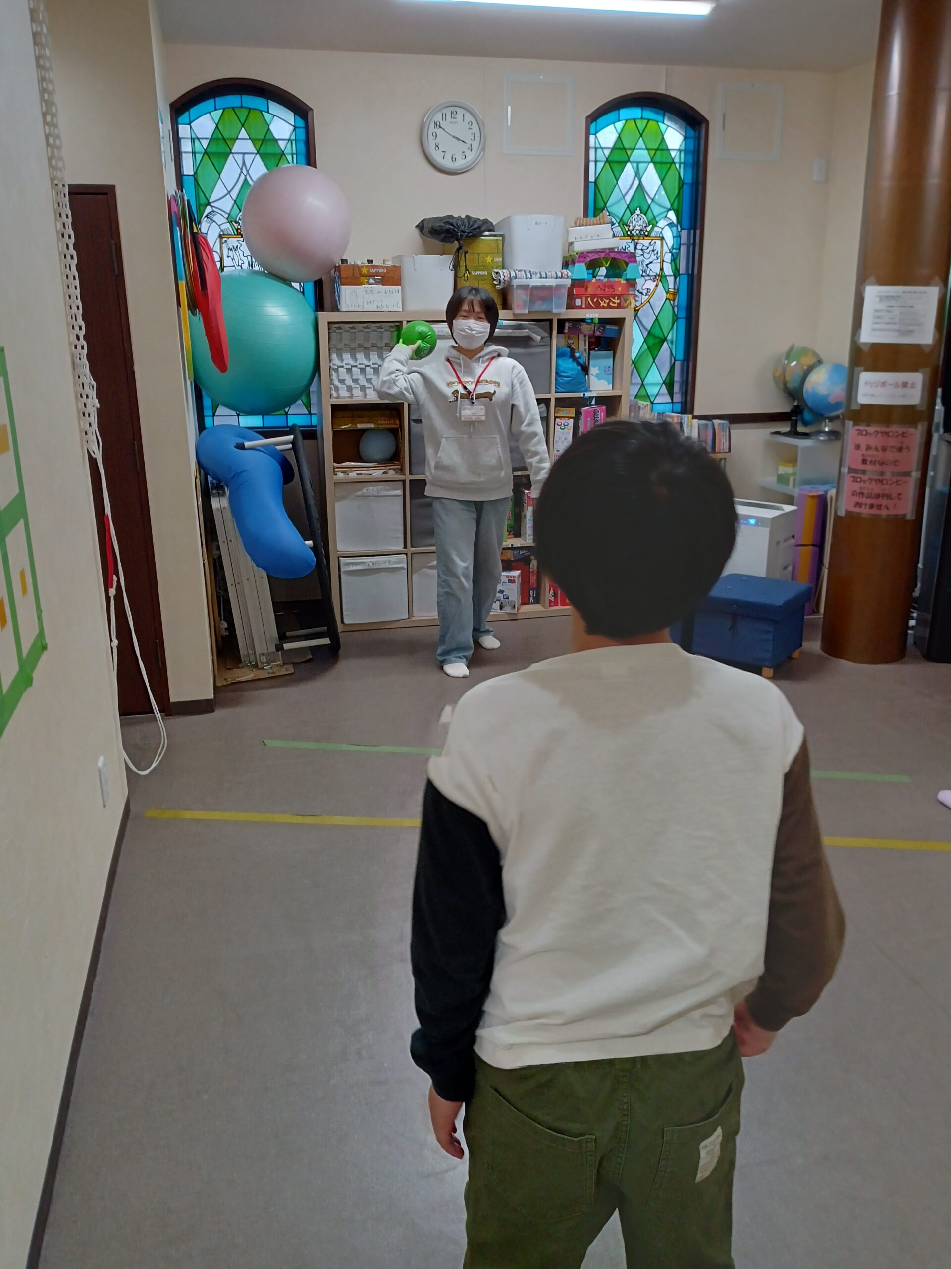 初めは、カチッとキャッチで運動をしているところからです~♪いつも野球ばかりしているので、たまには違うことしよう!と誘って選んでくれたのですが・・・この後、急に「オレ、キャッチャーするから、ここにボールが来るようにしてな!」とキャッチャーミットのように構えて座り、スタッフはピッチャーをしていました。本当に野球が好きなんですね~(`・ω・´)b