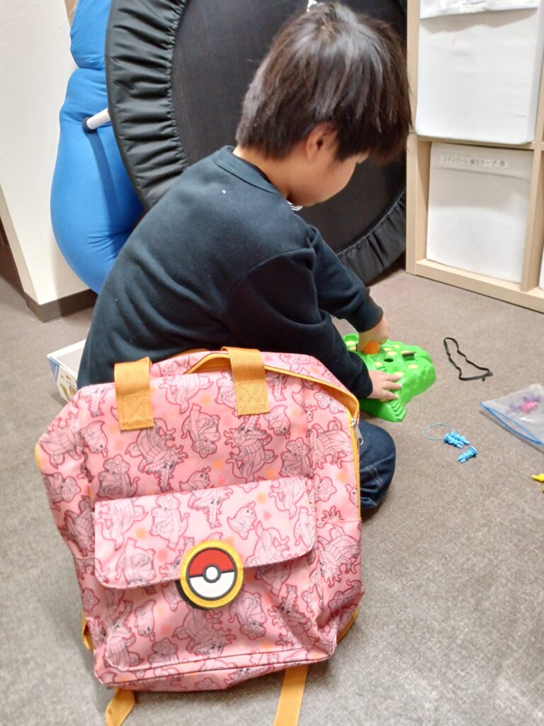 本日の写真は、いつもと違うバッグを持ってきた子どものお話です。「バッグ、変えたの?」というスタッフの呼びかけに、「クレーンゲームでお母さんと一緒に取ったよ」と嬉しそうに教えてくれました。長いことゲームセンターに行っていないスタッフは、バッグまであるんゃとびっくりしました。親子でクレーンゲームいいですね。