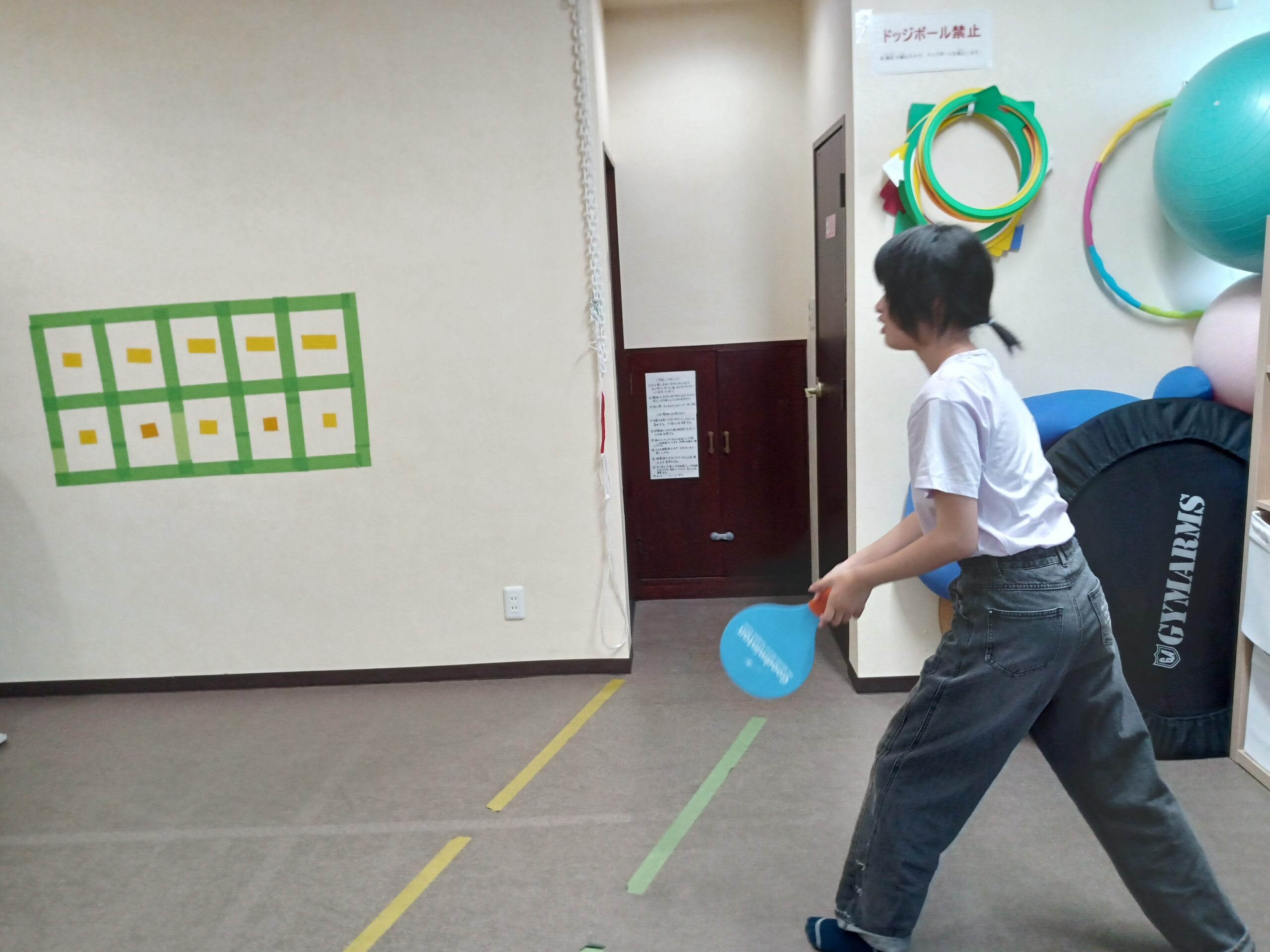 ウレタンポールに黄色と赤色のテープを巻いて、風船をはじくトレーニングは、ビジョントレーニングになっています。スタッフが赤色ではじいたら子どもは黄色ではじくというルールで活動しました。