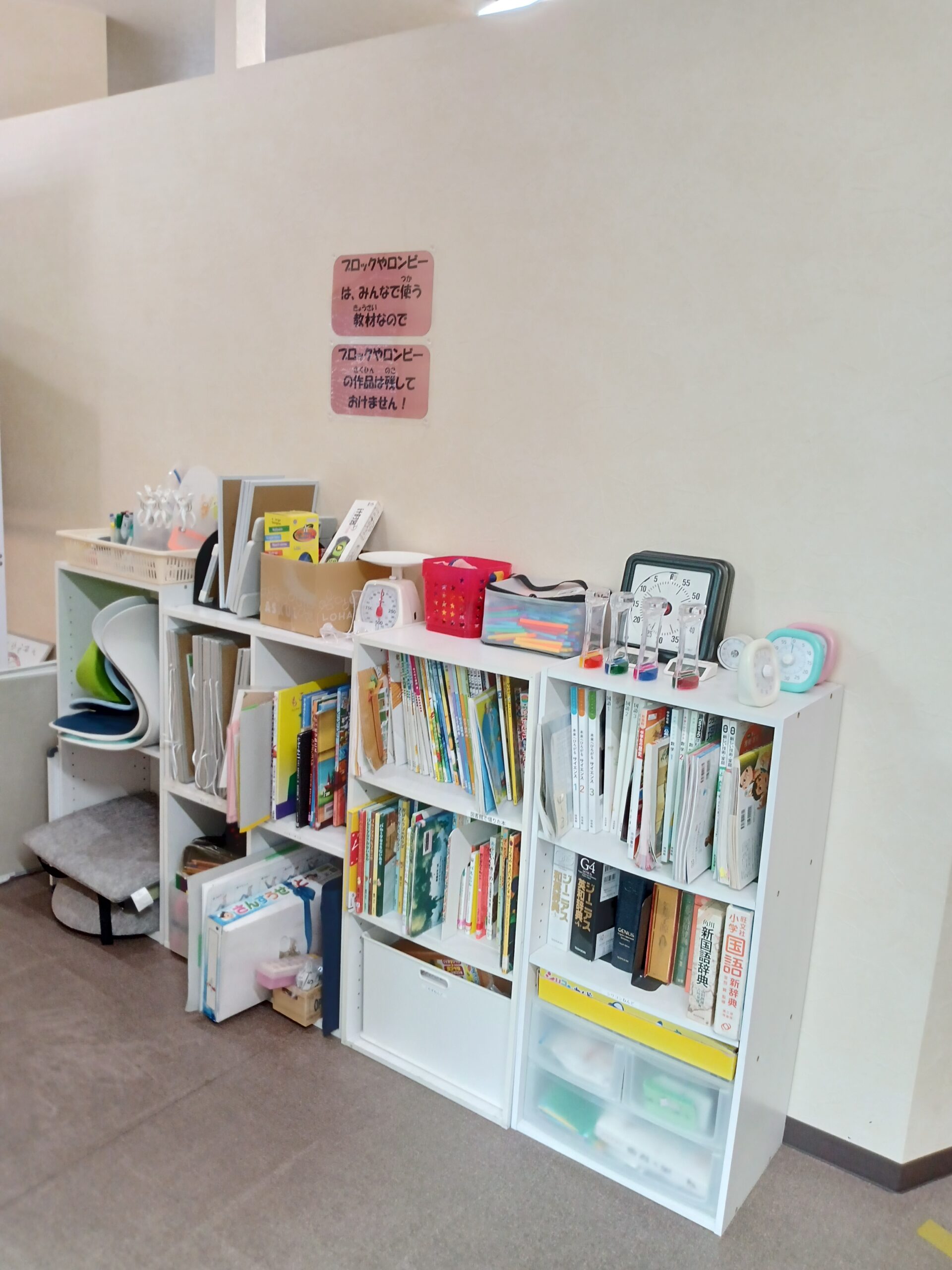 プレイルームへ向かう廊下の教材棚。教科書類はコチラにあります。