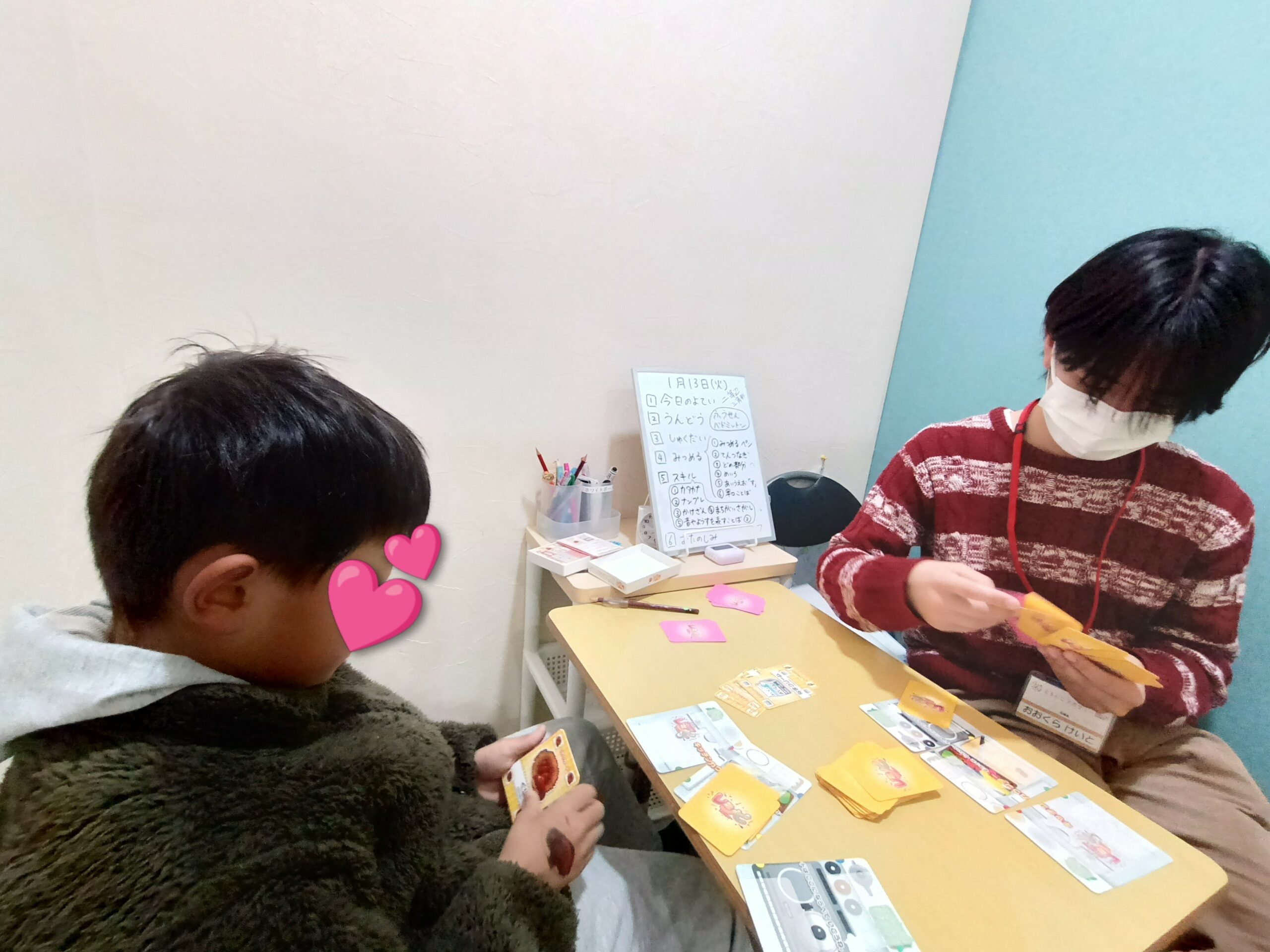 彼のお楽しみ時間はレシピというカードゲームをして過ごしていました。とっても真剣な表情でカードを見ていました。可愛い絵柄のカードゲームを彼もスタッフも真剣な表情でプレイしている様子にギャップを感じて、良いな~と思う瞬間でした(●^o^●)