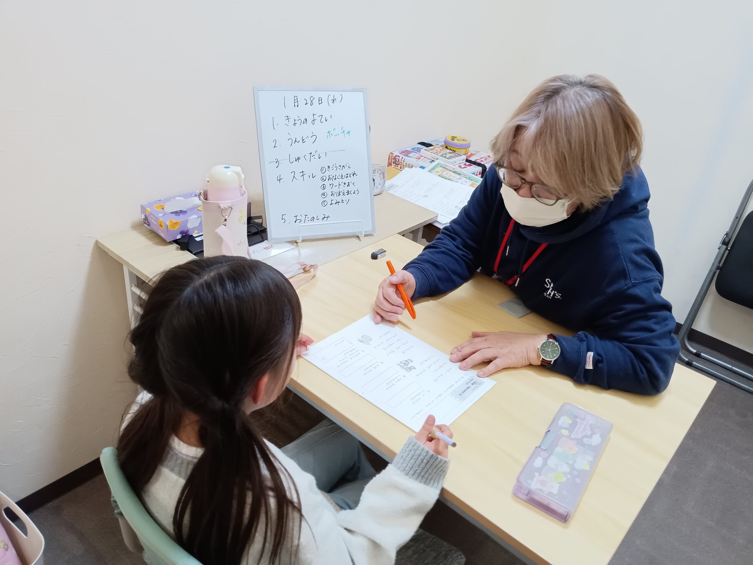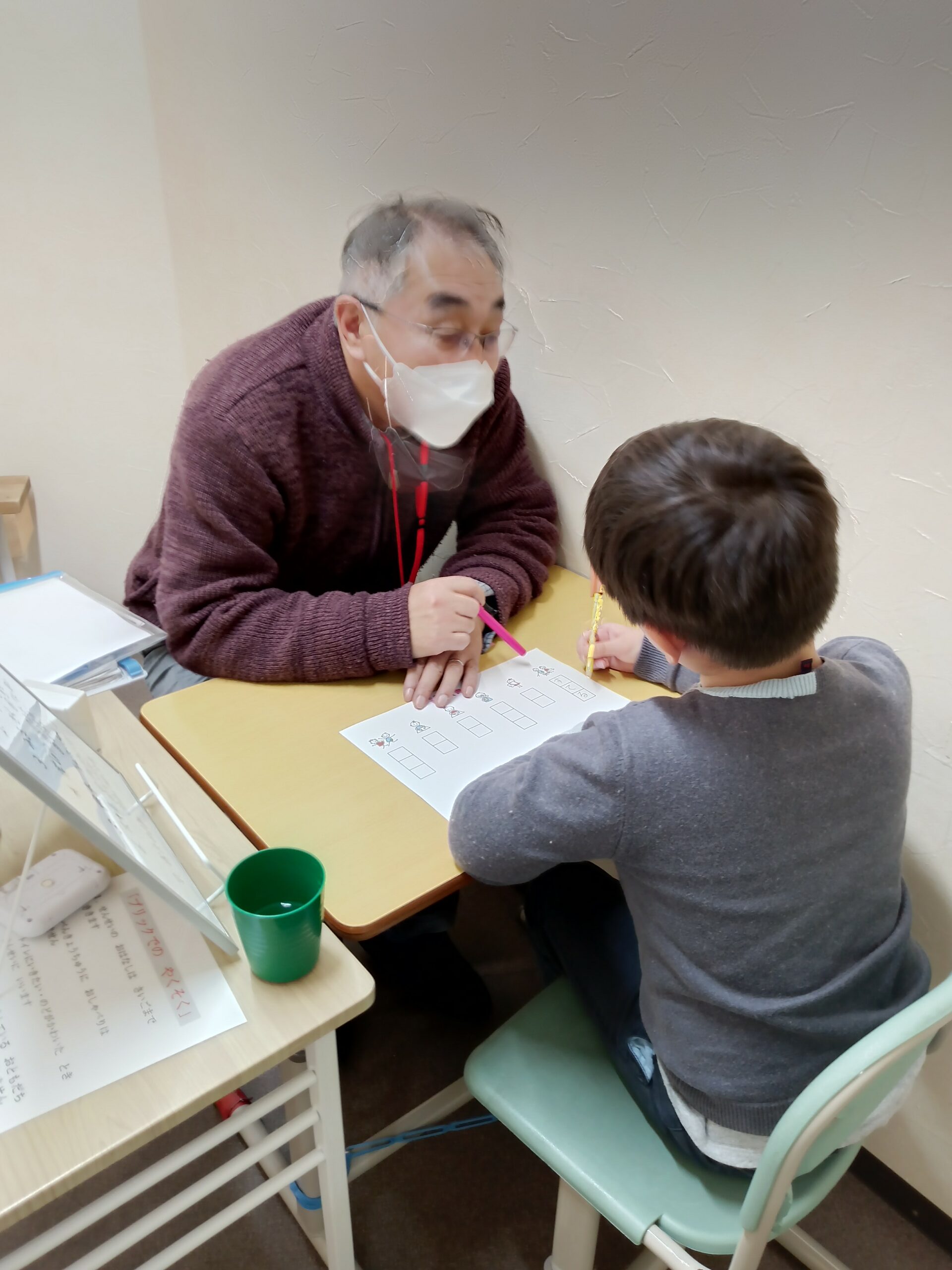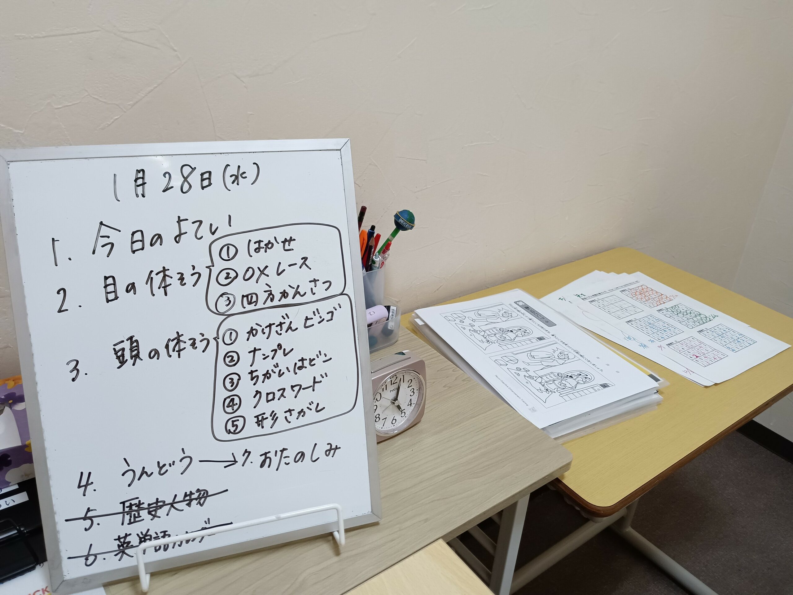 最後の画像、ホワイトボードについてですが、「ブリック」での活動には一人ひとり必ずこのホワイトボードを準備しています。(他の学習個室の画像にも映っています) これは、子どもたちが自分の活動内容を把握することで見通しを持って取り組めるからです。それと同時に、約1時間の時間を体感してもらい将来自分でスケジュールが組めるようになるためのトレーニングでもあります。