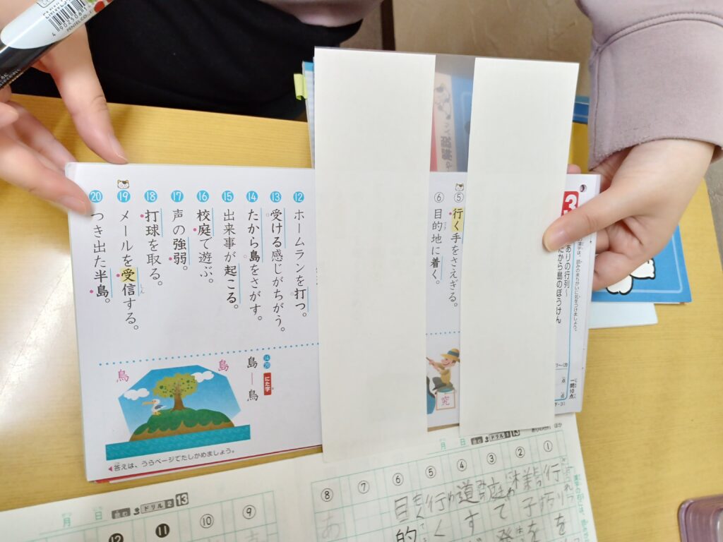 漢字の宿題に取り組んでいます。読むことがしんどい子たちに使うリーディングトラッカーを漢字用に行間を少し広い目にとって作りました。漢字がたくさん並んでいると、画数が多い字はごちゃごちゃしてしまい見にくかったのが、このトラッカーを使うことで見やすくなったと言ってくれました。四股市でもしんどさが減っていたら嬉しいです~