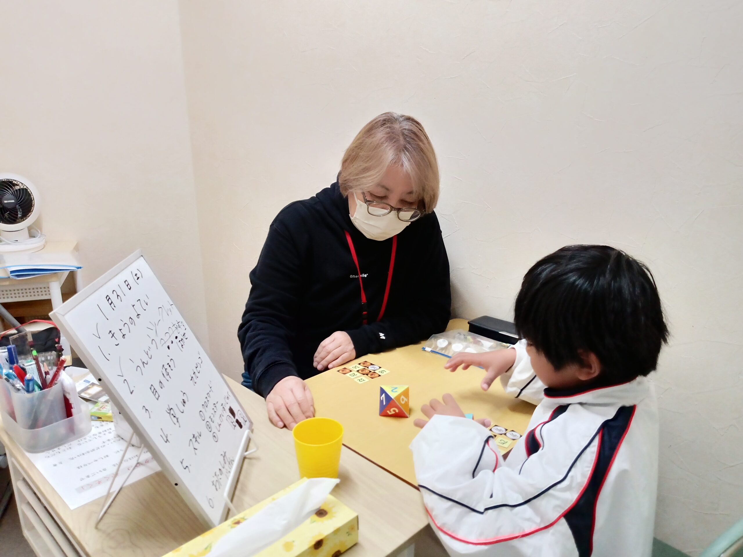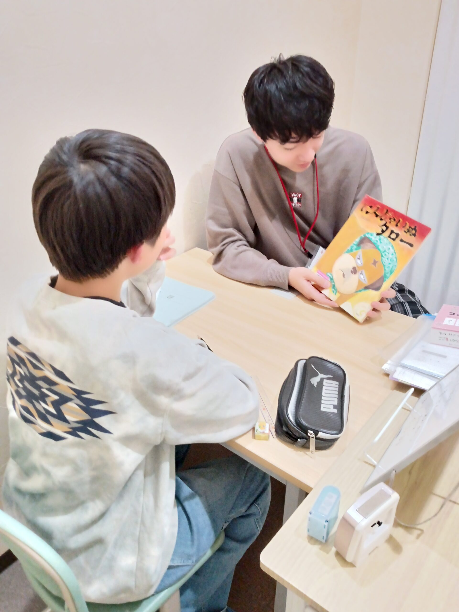 3枚目の画像、彼のカリキュラムには読み聞かせの活動があります。彼に読んでもらうのではなくてスタッフが読んで彼には終わってからの感想を話してもらう活動です。