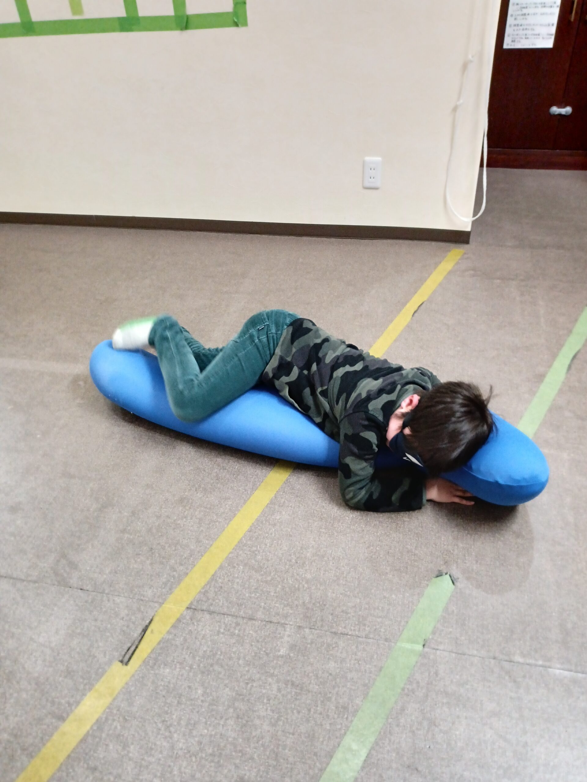 初めは、こちらから提案した形で取り組んでいますが、そのうち自分のリラックスできる形を模索して、いま彼は抱き枕がお気に入りな感じです☆彡