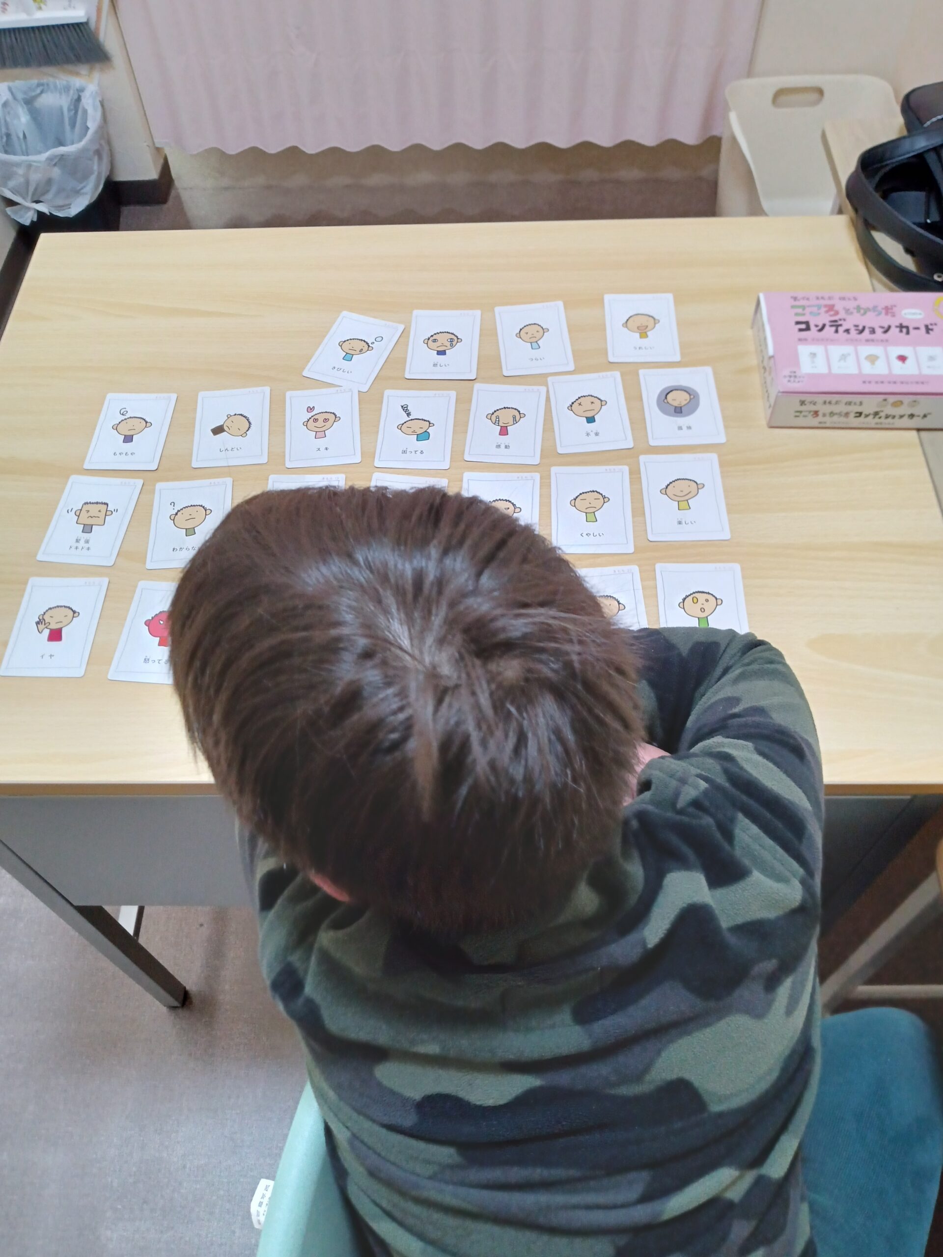 今日は、はじめてコンディションカードを使って活動しています。今の自分の気持ちや体調を表現していきます。嬉しかったことや楽しかったこと、心配なことや困ったことなど、うまく伝えられなくてもカードで表すことができればいいなぁと考えて取り組んでいます。はじめは、戸惑いもあるかもしれませんが少しずつ自分の気持ちが確認できて、相手に伝えられることで気持ちが楽に過ごせたらなと思います。