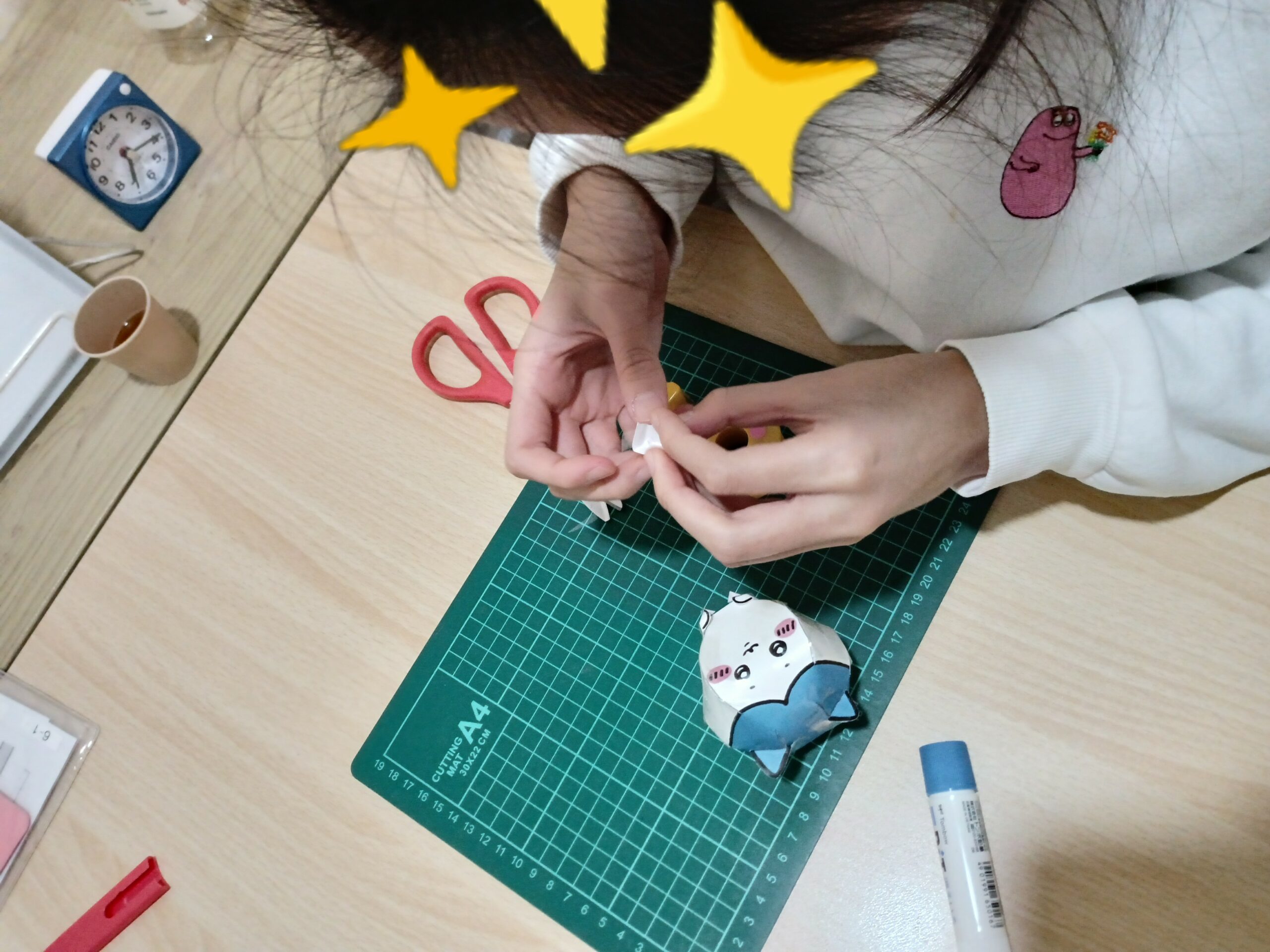 一人ひとり内容は違いますが、彼女はちいかわフレンズの中の「ハチワレ」のペーパークラフトに取り組みました。立体的な「ハチワレ」を作るのにとても細かい作業でしたが、器用な彼女は手際よくてビックリです。細かい箇所をセロテープで止めるために、前もってテープを小さくいくつも切っておいて仮置きしている作業も難なくこなしていました。