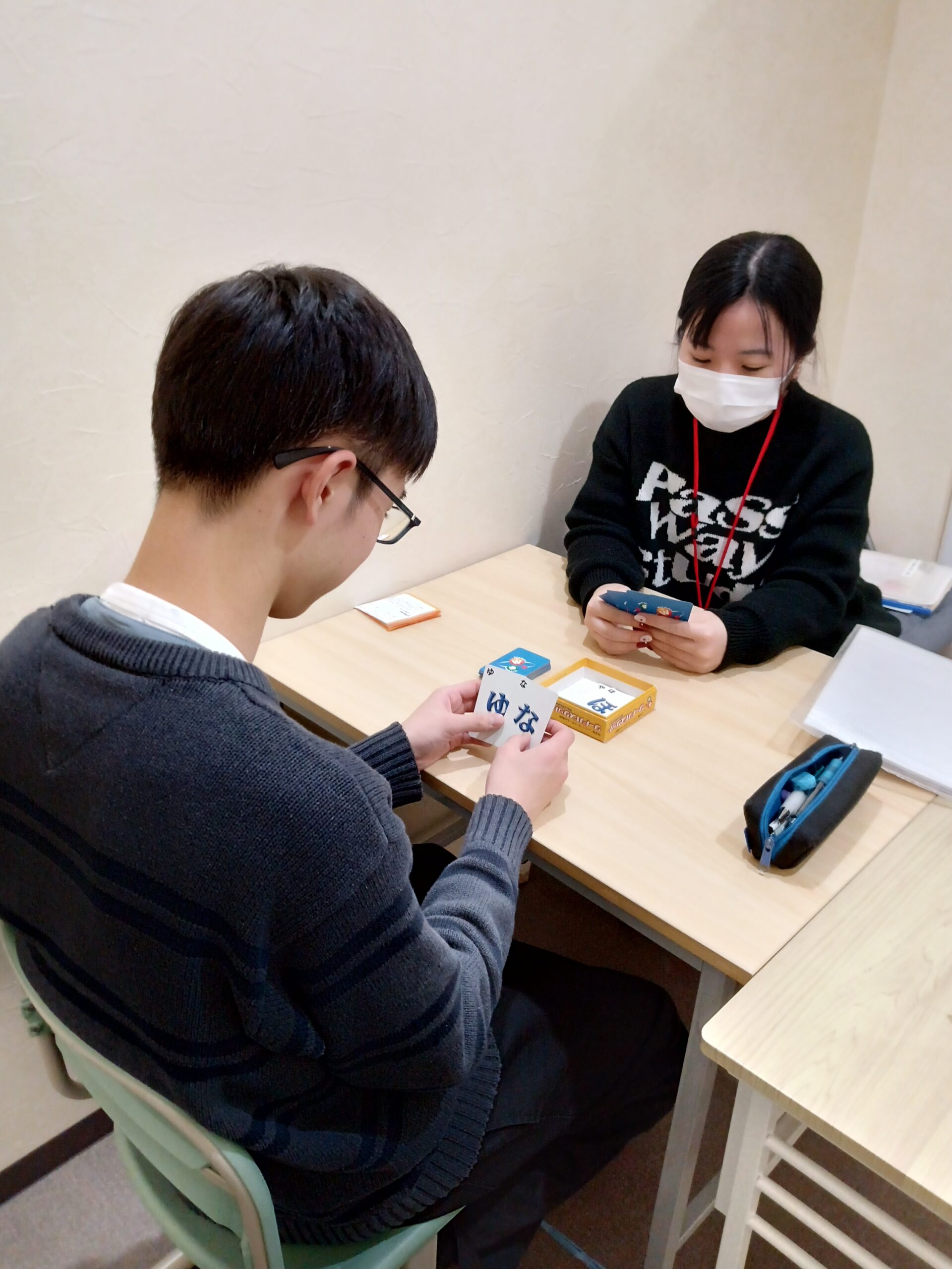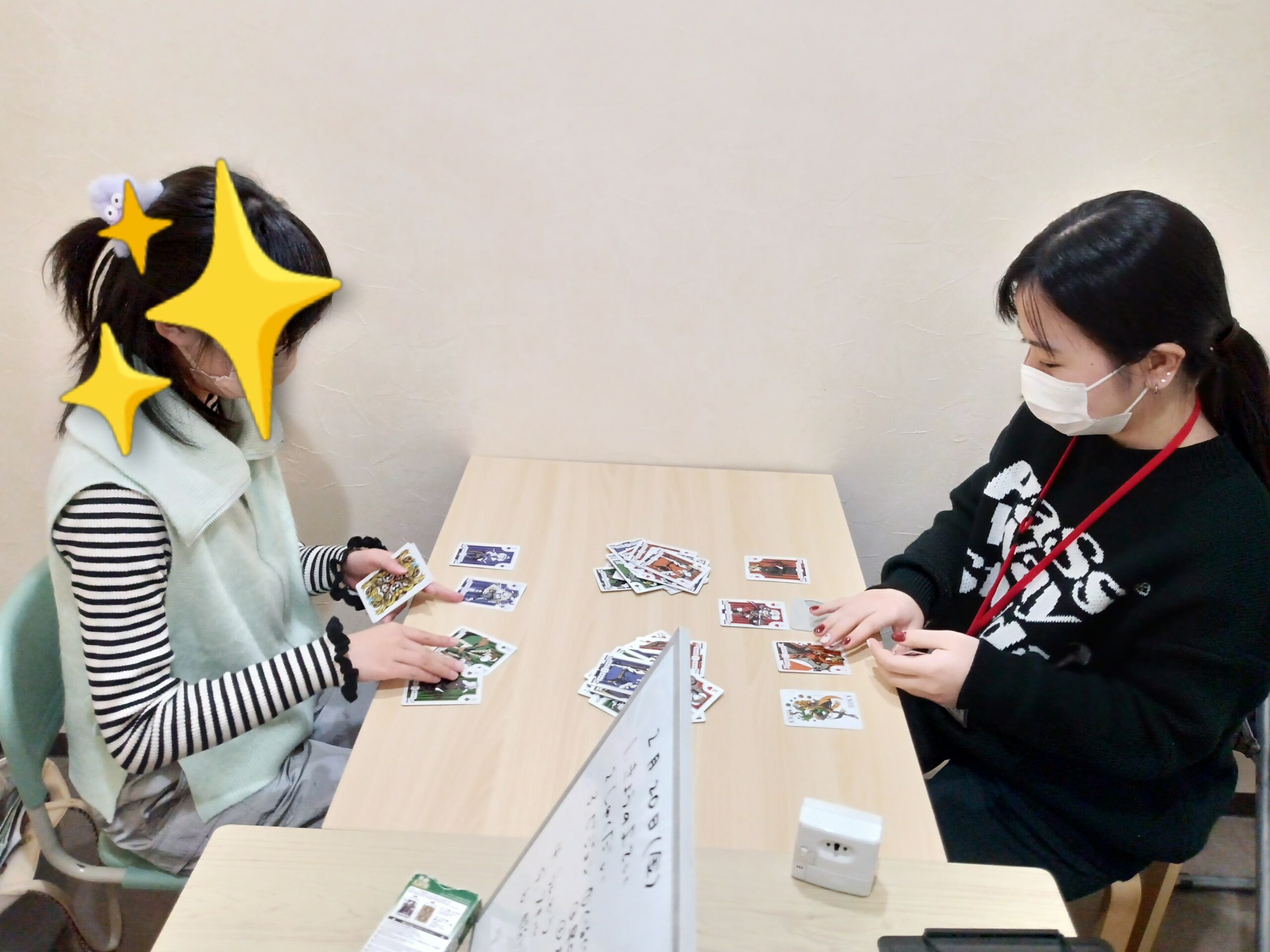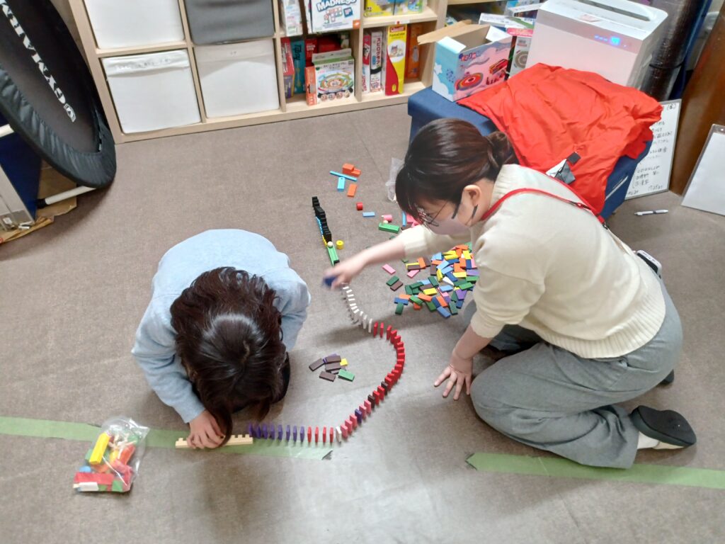 最後は、いろいろな活動の中でも、子どもたちが楽しみにしてくれている、おたのしみやリラックスといった活動です。トランプをしたり、ドミノをしたり、ワードバスケットをしたり…それぞれのやりたいことをして終了しています。楽しすぎて、なかなか時間通りに終われないこともあります。1時間頑張った「ご褒美タイム」ですが、それだけではなく、時間を守ることや切り替えができるようになる練習にもなります。
