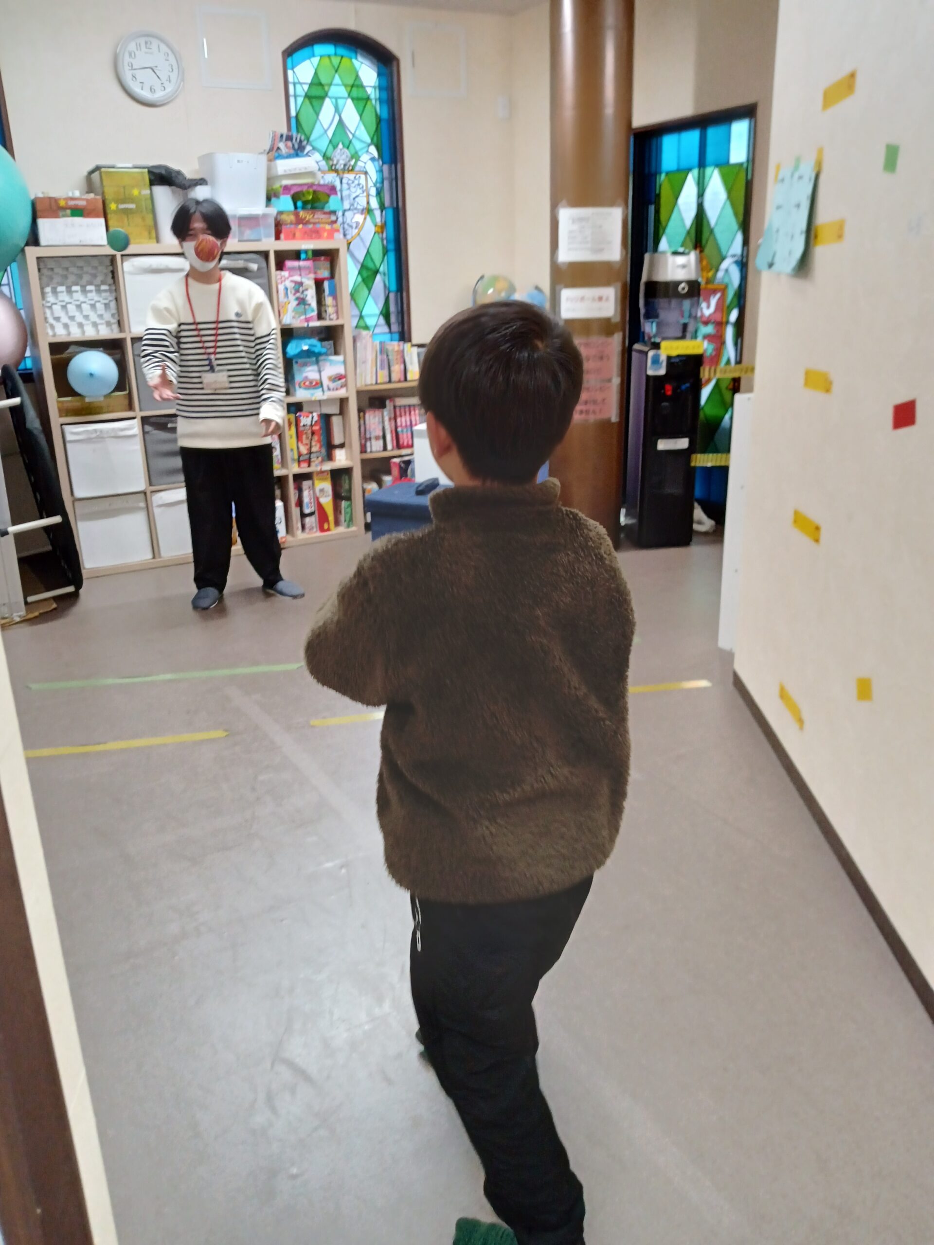 ”バウンスボール”というテニスボールくらいのサイズのボールでキャッチボール中です!よく跳ねるので力加減を意識してバウンドで相手に渡せるように投げています。意識しないといろんなところに飛んでいくので、とても集中していましたよ(⌒∇⌒)そして、同じタイミングでそれぞれボールを投げて、相手が投げたボールをキャッチしているのでビジョントレーニングにもなります👀🥎