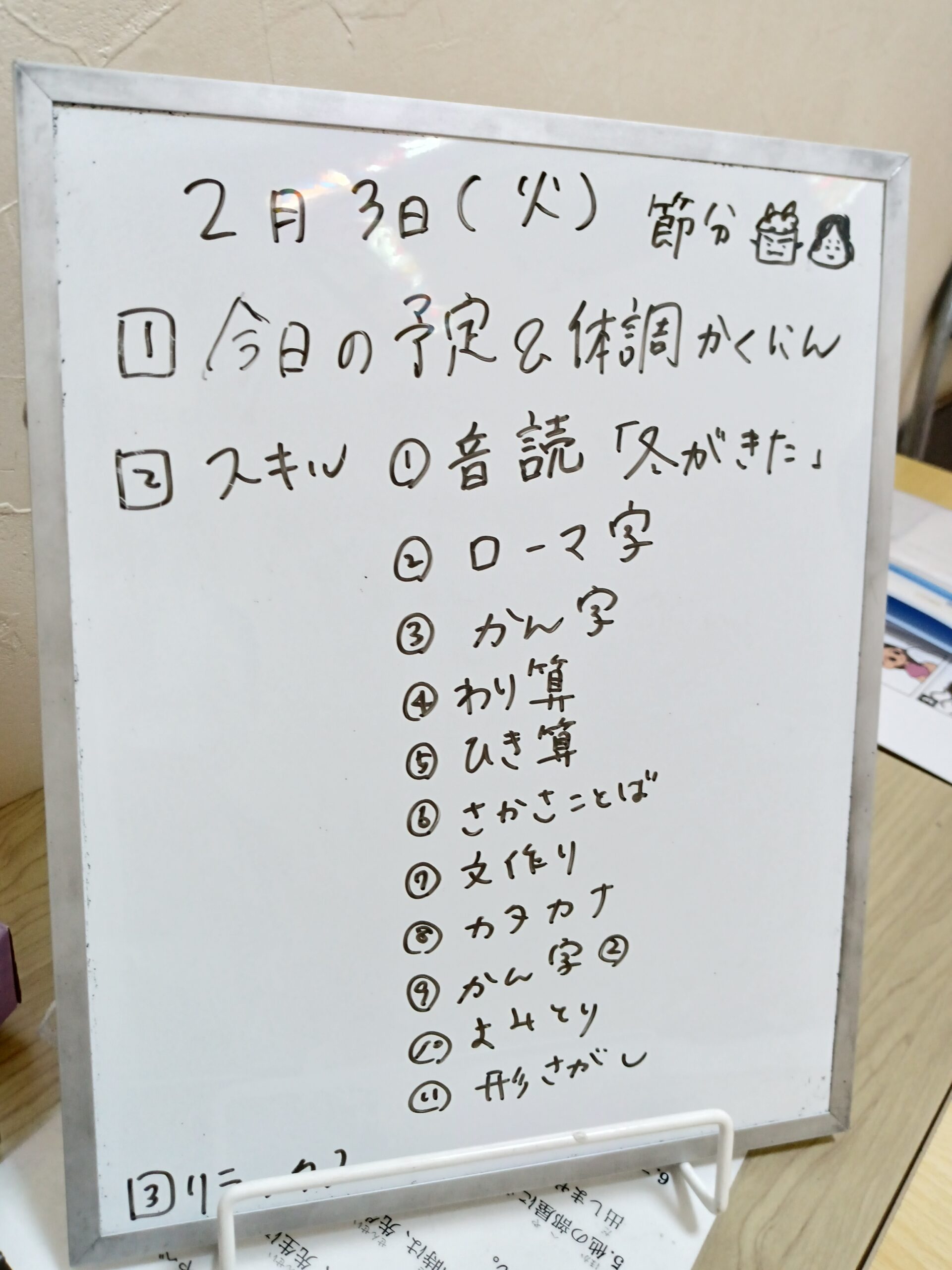 学習を頑張った後、スタッフと豆をいくつたべるかを話していました。歳の数だけ豆を食べて、今年一年、健康で元気に過ごしていきたいですね〰