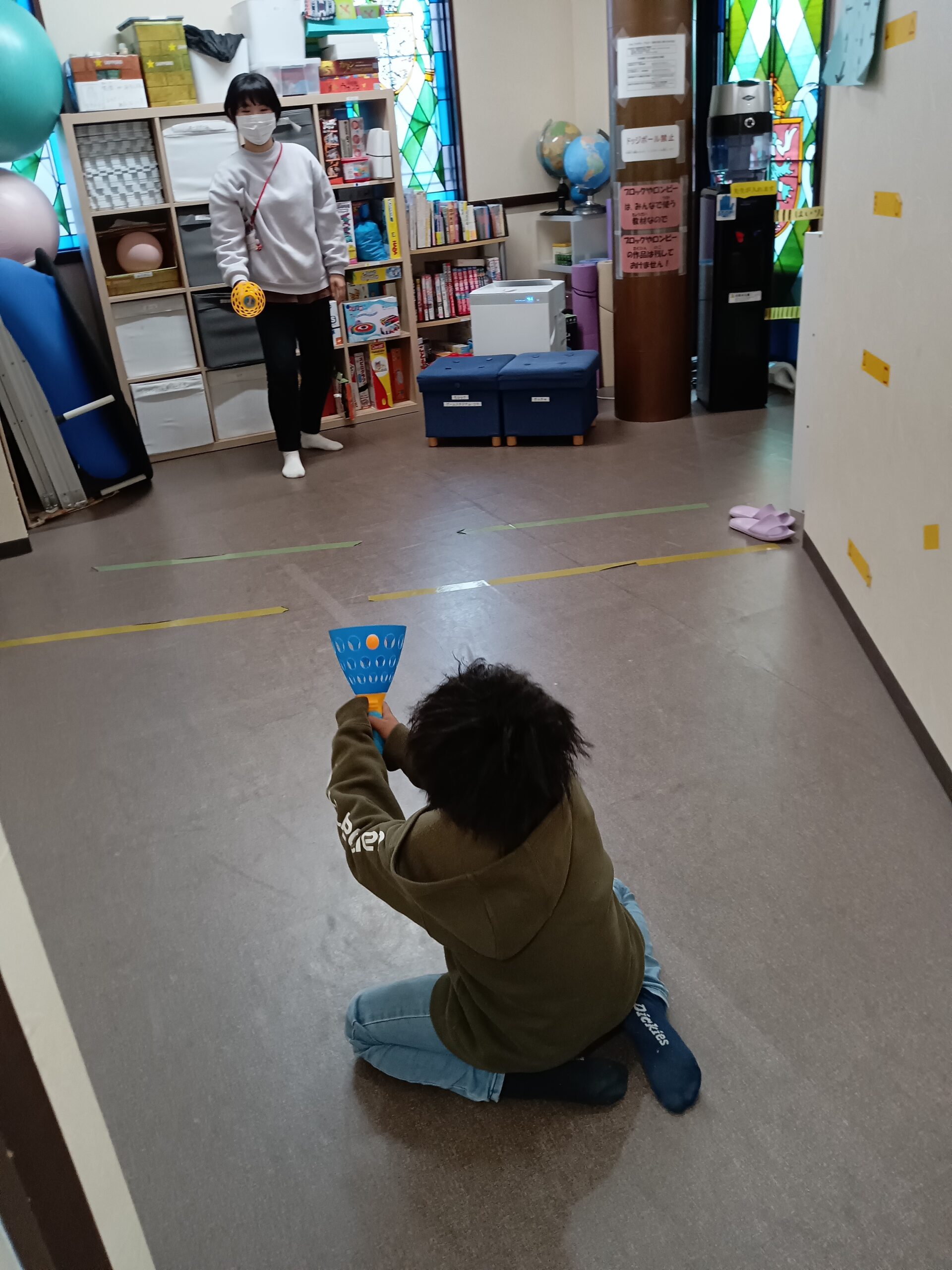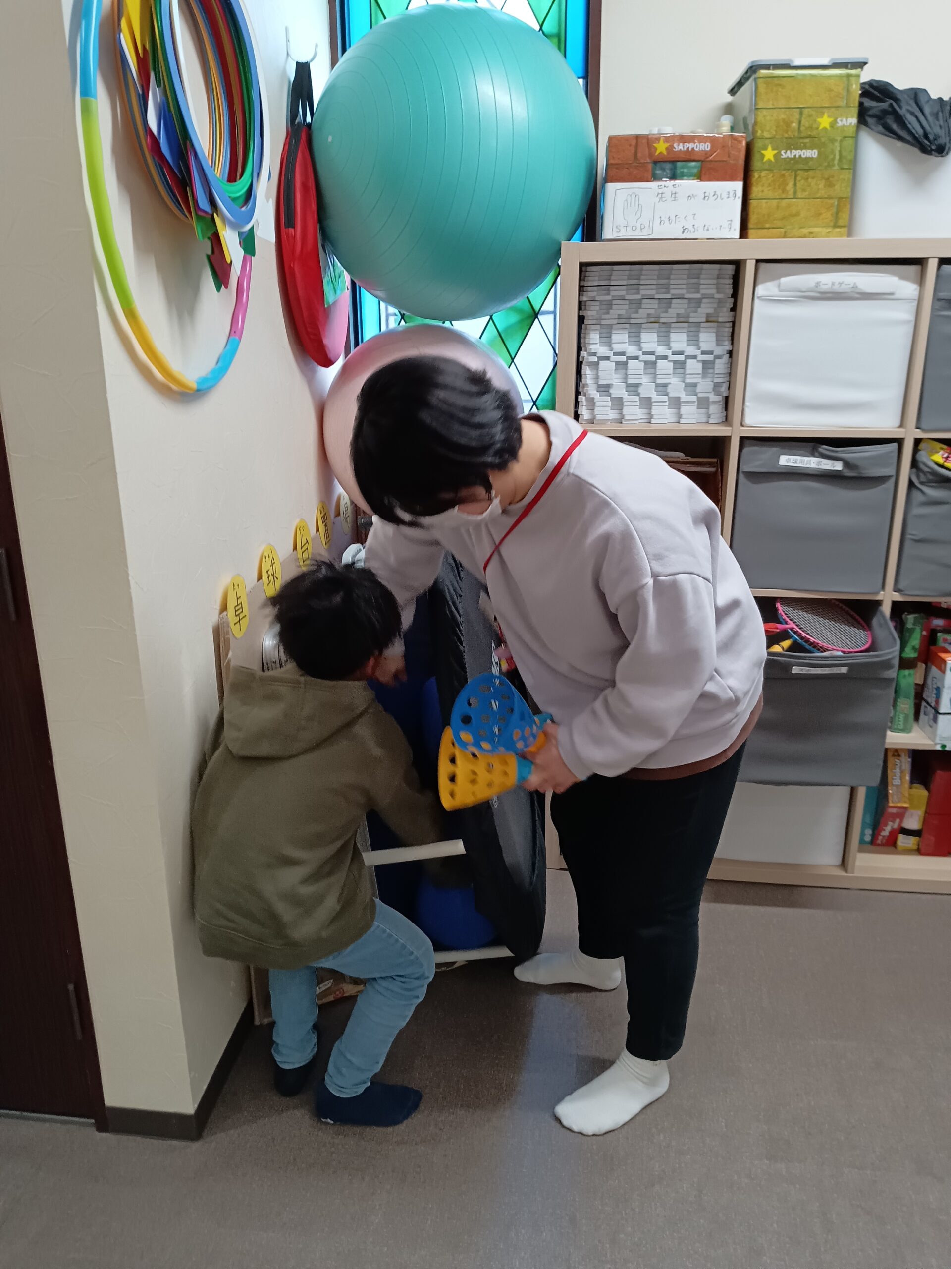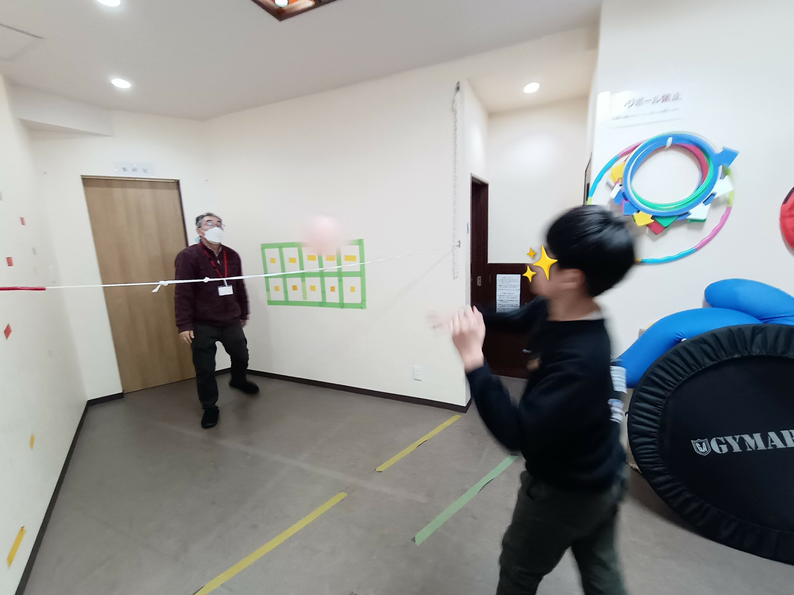 隙間に飛んだピン球を、自分ならとれる!と取ろうとしてくれています。ケガをしないようにトランポリンを支えながら、お願いしました。