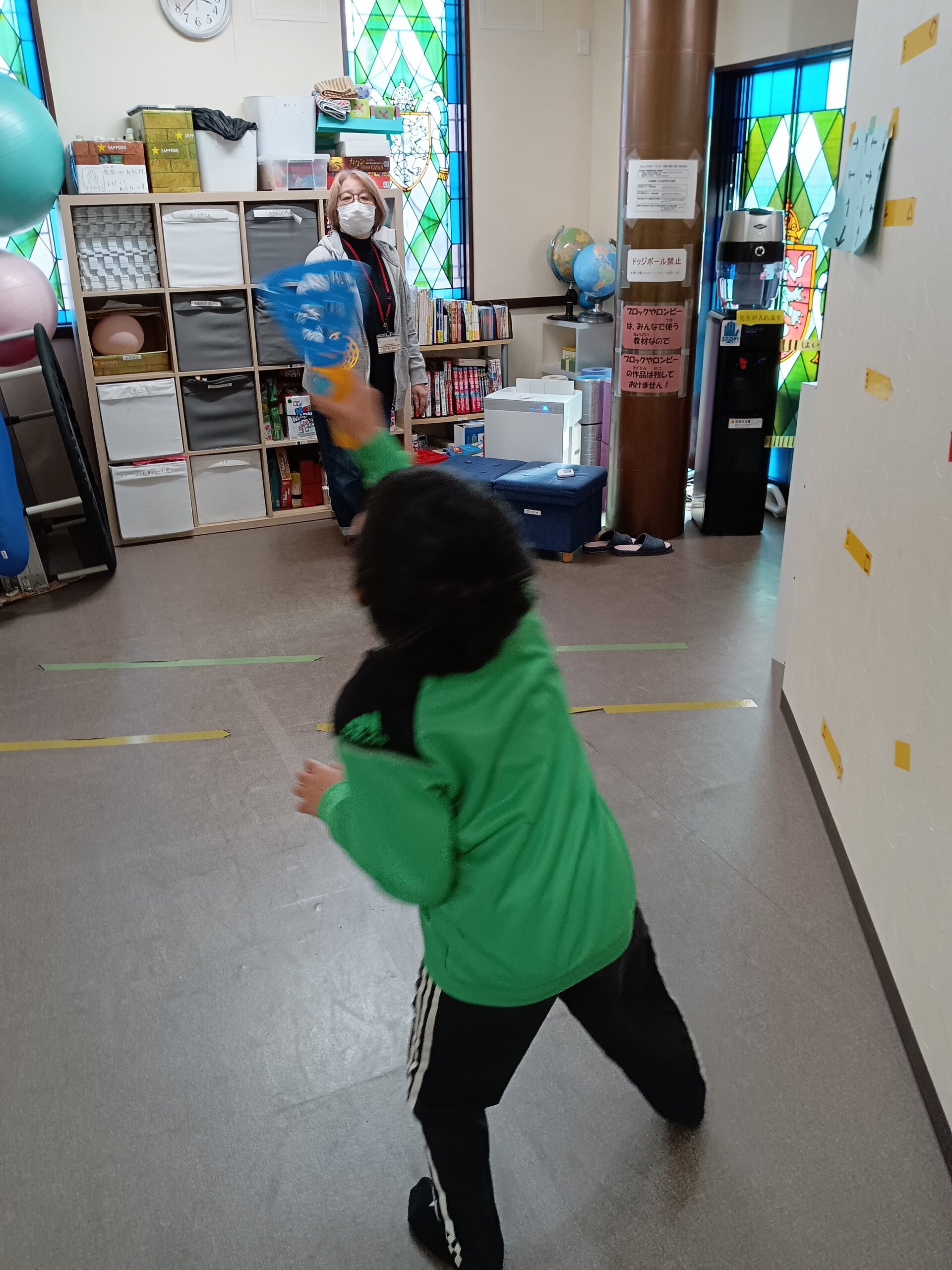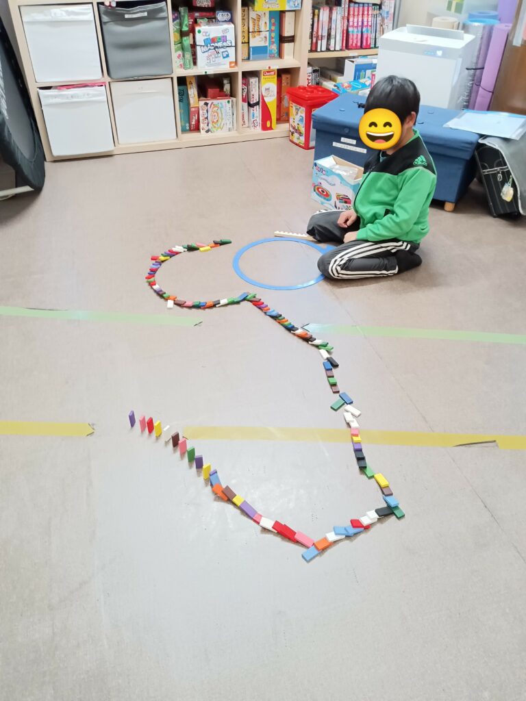 最後の写真は、お楽しみの時間に、並べたドミノを倒しているところです。集中してコツコツ、ドミノを並べた彼は、お母さんがお迎えに来ていただいた瞬間、ドミノ倒しをスタートしました。見事に全てのドミノが倒れ、大満足。よかったね。