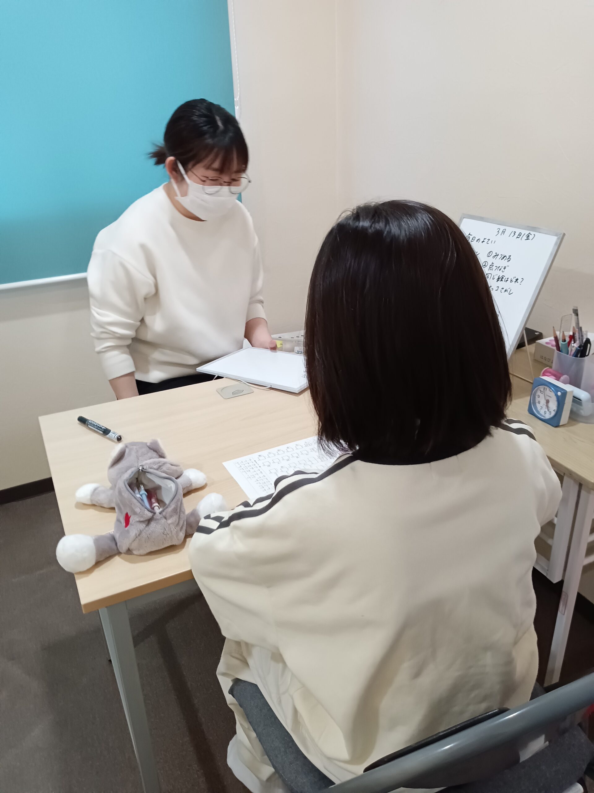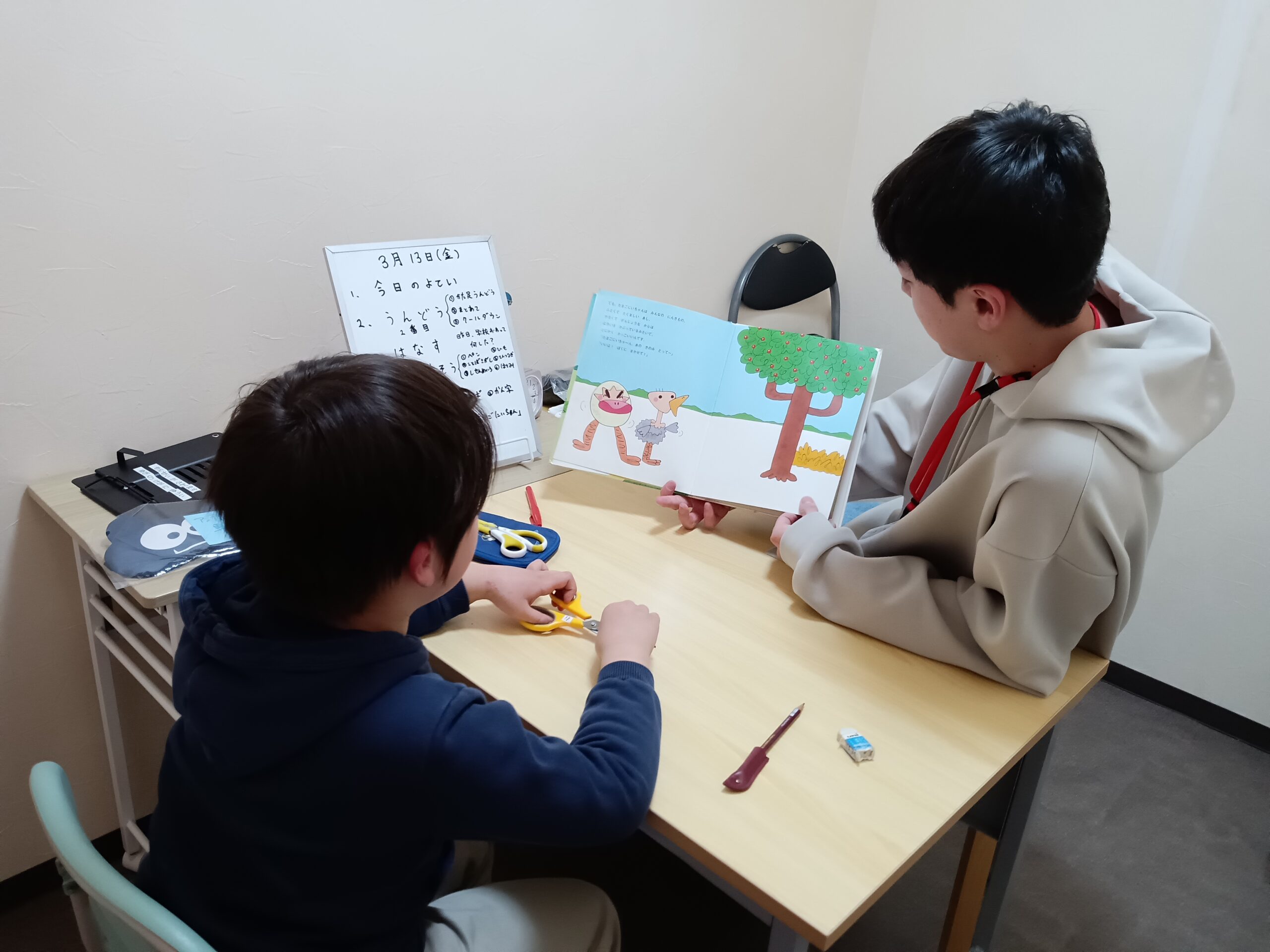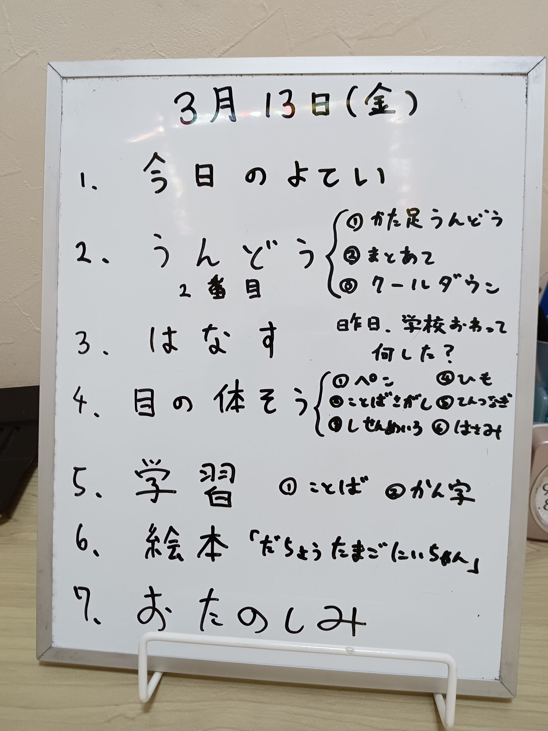そして、子どもたちも自分でホワイトボードを読んでくれることが増えてきています。読みながら、今日の自分の活動内容を確認している子も多いです。「これ、好き!」「え~」「なんでこれするん?」などなど、色んな言葉が出てきます。私たちは、子どもたちが取り組む気持ちが持てるように説明しています。