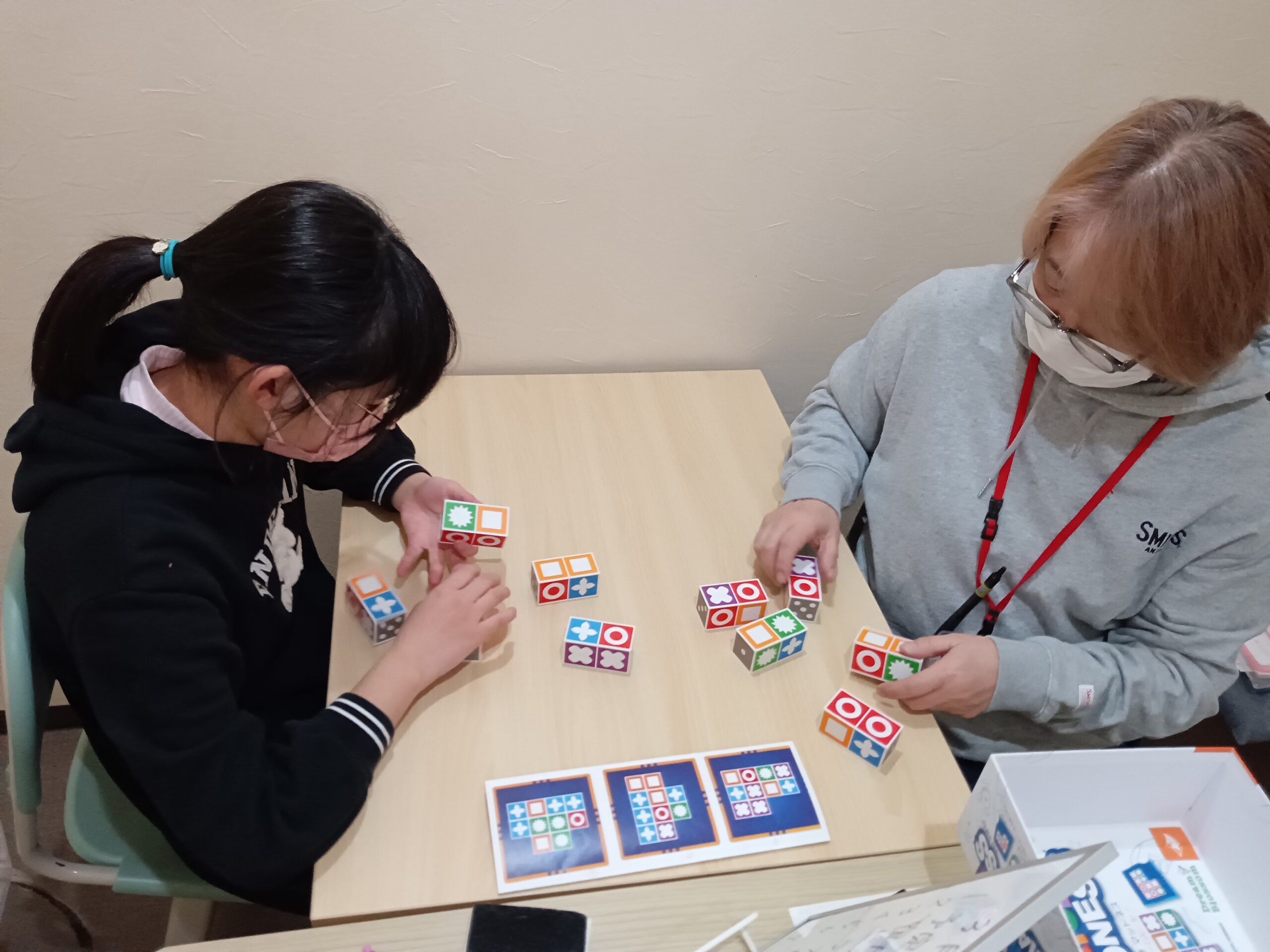 『マッチマッドネス』というブロックゲームです。一番早くカードと同じパターンに並べられた人が勝ちなのです。このゲームは、視覚と手と脳を連動させて考えることができるゲームです。お互い、1秒でも相手より早く正解したいので、毎回真剣勝負です~彼女は視覚が強いので、なかなか勝てません( ;∀;)