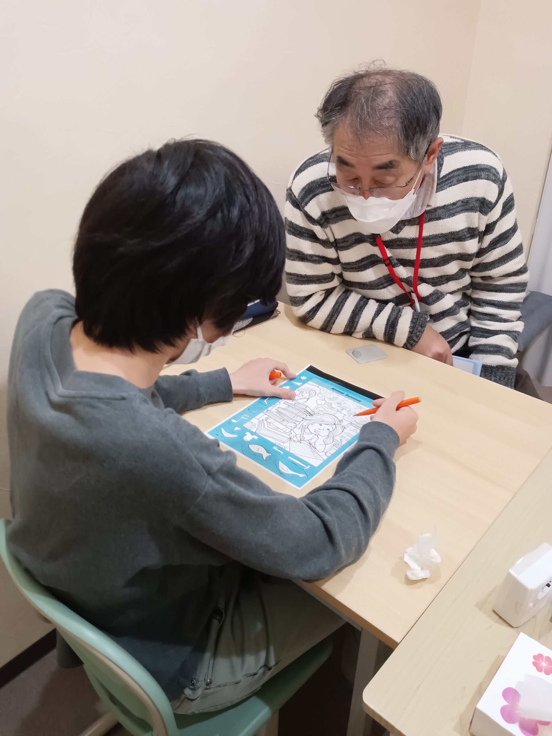 ビジョントレーニングの一環で、形さがしをしています。一つの絵の中にいろんな形が巧妙に隠されているのを探していきます~